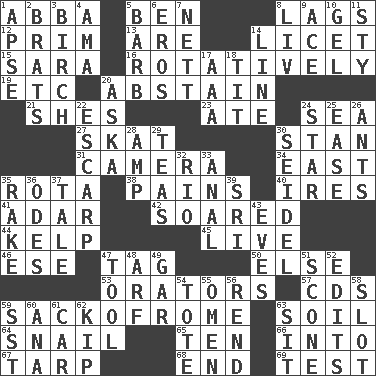 ACROSS 1. Swedish rock group 5. Benjamin's nick name 8. Falls behind 12. Demure 13. "We ___ not amused" (Victoria) 14. It is permitted: Lat. 15. "Two Mules for Sister ____" 16. Producing rotation 19. And so on (abbr.) 20. Refrain by choice 21. "______ My Girl" (Turtles hit) 23. Had dinner 24. Ocean 27. Three-handed card game 30. Comedian Laurel of Laurel & Hardy 31. Device for capturing images 34. 90 degrees 35. Round or rotation of duties 38. Aches 40. Angers 41. The sixth month of the Jewish calendar 42. Flew 44. Seaweed 45. Moving, as bait 46. Compass dir. 47. Label 50. Otherwise 53. Speakers 57. Music discs 59. Italian handbag shop? 63. Earth 64. Slow-paced one 65. Nine, plus one 66. To the inside or interior of 67. Canvas cover 68. Conclude 69. Trial DOWN 1. Domed church section 2. Naughty children 3. A tree used for making furniture 4. Housemaid (var.) 5. Sharp remark 6. Greek god of love 7. Remaining after all deductions 8. 54 in ancient Rome 9. Adept person 10. Set 11. Filthy place 14. Actor's bit 17. Auto club (abbr.) 18. Teat (slang) 20. "____ silly question..." 22. Fortification 24. Play the lead 25. Relaxation 26. Pismires 28. Electrical Unit 29. Beverages made from leaves 30. A glass for beer 32. River (Sp.) 33. Of or related to the anus 35. Immoral or dissolute person 36. Lyric poems 37. Story 39. _ Lanka 43. Nights before holidays 47. Instrument 48. Sandy's bark 49. Slender fish 51. Biscuitlike quick bread 52. Proofreads 54. Carryall 55. Sign of something about to happen 56. Tear apart 58. Groove 59. Fast jet (abbr.) 60. Santa ___, CA 61. 4-wheeled motor vehicle 62. Sleep 63. Be seated