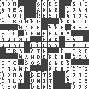 ACROSS 1. Not either 4. Moves 8. A female animal or person 11. Length times width 13. Singer Murray 14. Grant temporary use of 15. Pulled tight 16. Remainder 17. Small Philippine buffalo 18. Shoved, as through a crowd 21. Honor 22. Create 23. Perceive with the eye 25. To separate or throw off 26. Pipe bend 29. 3-inch nail 32. Wet 34. Possessed 35. Consume 38. Freehold land 39. Soft thread for cleaning between teeth 41. 57 in ancient Rome 43. Retirement account (abbr.) 44. The 18th letter of the Arabic alphabet 45. Seductive woman who exploits men 46. Roamer 50. Ocean 51. And so on (abbr.) 54. Mayday 55. Singles 57. _____ steamer (cargo ship) 59. Inveterate users 63. Israeli folk dance 64. Wagers 67. Old wives' tales, e.g. 68. In an inward manner 69. A single undivided whole 70. Writer Wiesel 71. Corporate head (abbr.) 72. Cub Scout units 73. Two (Sp.) DOWN 1. Nathan's nickname 2. Of the mouth 3. Reuben's nickname 4. Place where plants grow 5. Single 6. Followers of ems 7. Arrange properly for use 8. Underwater navigation system 9. White Person, in Hawaii 10. Maternal 12. Tiny particle 14. Not strict 19. Electrical Unit 20. Supplement with great effort 21. Car or cant ending 23. Oceans 24. Extremities 26. Australian flightless bird 27. Farming town in central California 28. One who doesn't tell the truth 30. Give a jingle 31. Shout 33. Cole _ (cabbage dish) 36. Deliberation 37. Hoop that covers a wheel 39. Papal veil 40. Hats (slang) 42. Call ___ day 45. Flintstone 47. Cleo's killer 48. Ridicules or criticizes harshly 49. Conclusion 51. Value system 52. Marketplace scale 53. Monte _, Las Vegas Hotel/Casino 56. Drop; flow; fall 58. Fifth month 60. Chilled 61. Musical group of three 62. Observes 64. Partially opened flower 65. Compass dir. 66. Metal container