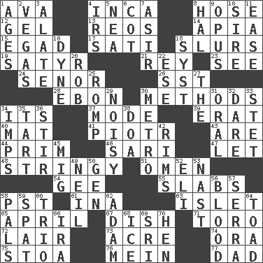 ACROSS 1. Actress Gardner 4. South American Indian 8. Stockings 12. Set 13. Vintage cars 14. Capital of Western Samoa 15. Mild oath 17. Suttee (variant) 18. Runs notes together 19. Man with strong sexual desires 21. Marina Del _, California 23. Observe 24. Sir (Sp.) 26. Fast jet (abbr.) 28. Inky black, to poets 30. Modes 34. ___ a Wonderful Life 37. Method 39. Part of Q.E.F. 40. Floor covering 41. Peter (Polish) 43. "We ___ not amused" (Victoria) 44. Demure 46. Indian skirt 47. Allow 48. Slender, wiry 51. Sign of something about to happen 54. Turn to the right 55. Thick slices 58. Pacific Standard Time (abbr.) 61. _ tizzy (2 wds.) 63. Small island 65. Showery time 67. Food container 71. "Corrida" creature 72. Den 73. Land measure 74. Mouth or opening 75. Portico 76. Chow _ 77. Male parent DOWN 1. Eons 2. Viva Las _ 3. Having winglike extensions 4. Big collection agency 5. Teachers' org. 6. Small bed 7. SW Saudi Arabia district 8. Actor Linden 9. Musical composition 10. Title for a man of rank and authority 11. Comfort 16. Centimeter-gram-second unit of force 18. System (abbr.) 20. Director Reiner 22. Compass dir. 25. Play 27. Definite Article 29. Annoyingly loud 30. Paris' subway 31. Taken by mouth 32. Have the gumption 33. Proofreading order 34. Naughty children 35. Small pie 36. Agitate 38. ___ good deed 42. Basketball hoops 45. Russian fighter aircraft 49. Famous astronaut Armstrong 50. Commissioned mil. rank 52. Connecticut Ivy Leaguer 53. Political cartoonist Thomas 56. Vital fluid 57. Spanish missionary in California 58. Friends 59. Petty quarrel 60. Musical group of three 62. First of billions? 64. Frog relative 66. Retirement account (abbr.) 68. Frozen water 69. Indian title of respect (Mr.) 70. Layer