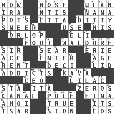 ACROSS 1. Immediately 4. Characteristic smell of wine 8. ____ Bator 12. Retirement account (abbr.) 13. Nuclear Threat Initiatives 14. Nanny 15. Cooking vessels 17. Singer James 18. Short, simple song 19. Contemptuous expression 21. Purpose 23. Part of HMS, perhaps 24. Lowest deck of a ship 26. Biblical high priest 28. Pick up the tab 30. Apple salad 34. Title for a knight 37. Singe 39. One of the Great Lakes 40. Adept person 41. Keyboard key 43. Mature 44. Monthly bill 46. Tenth: prefix 47. Hat (slang) 48. Inveterate users 51. Polynesian shrub of the pepper family 54. Corporate head (abbr.) 55. Pale purple color 58. R.R. building 61. Call ___ day 63. Nothings 65. Lessep's creation 67. Whimper 71. Inactive volcano in Sicily 72. Mine, in Marseilles 73. Loyal 74. ___ a Wonderful Life 75. Russian ruler of old 76. The Jewish people; Israel 77. Begley and Asner DOWN 1. Pinches, bites 2. U. of Maine site 3. Wetness 4. Compass dir. 5. Baseball player Mel 6. Be seated 7. He sold his birthright 8. Corn or form start 9. Thin strip of wood or metal 10. Against 11. Negative votes 16. Automatic 18. Small valley 20. Friend of Pooh 22. Ocean 25. Introduce or present, as a question 27. Binary compound 29. Looks after 30. Raze 31. Relating to the mouth 32. Swiss mountan, "Queen of the Mountains" 33. Nourish 34. "Two Mules for Sister ____" 35. On the rocks 36. Tear apart 38. Had dinner 42. Monetary unit of Yemen 45. Nervous spasm 49. To provide with a ceiling 50. Small child 52. To wit 53. Toward shelter 56. Nick name for Arthur 57. Continued (abbr.) 58. Leave at once 59. Scottish caps 60. Small Philippine buffalo 62. Tenement units (abbr.) 64. Backtalk 66. Wind 68. RI univ. 69. Nilotic language 70. Car or cant ending