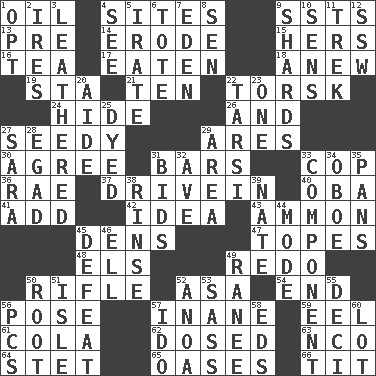 ACROSS 1. Lubricate 4. Settings 9. Fast planes 13. Before (prefix) 14. Wear away 15. Possessive pronoun 16. Beverage made from leaves 17. Ingested 18. Afresh 19. R.R. building 21. "___ Little Indians" 22. Cod relative 24. Flintstone garb 26. Added to 27. Full of seeds 29. Ancient Greek god of war 30. Match 31. Drinking establishments 33. Police officer (slang) 36. Actress Charlotte 37. Popular '50s hangout 40. Chief or king in Benin or Nigeria 41. Find the sum of 42. It may be bright or harebrained 43. ID or VA city 45. Habitations of wild animals 47. Drinks excessively 48. Raised railways 49. Do over again 50. Ransack; plunder; pillage 52. White ___ sheet 54. Conclusion 56. Airs 57. Silly 59. Snakelike fish 61. Root beer relative 62. Administered medicine 63. Non-commissioned officer (abbr.) 64. Proofreading order 65. Fertile tracts in a desert 66. Teat (slang) DOWN 1. Elect 2. Angers 3. Tough but pliablecoriaceous 4. Perceive with the eye 5. Feeling or showing extreme anger 6. Carryall 7. Paradise 8. Elected rep. 9. Pottery fragments 10. Elected reps. 11. Long journey 12. Compass dir. 20. Assistant 22. Tarsus (plural) 23. Single 25. Colored 27. "Two Mules for Sister ____" 28. Mild oath 29. Type of rug 31. Auction offers 32. "___ Maria" 33. Piece 34. Mitch Miller's instrument 35. Baking dishes 38. Wash lightly 39. Nathan's nickname 44. Method 45. Outscore 46. Pipe bend 49. Indian princess (variant) 50. Carrot, for example 51. Small island 52. Small Philippine buffalo 53. Backtalk 55. Tenth: prefix 56. Personal Computers (abbr.) 57. Wedding promise 58. Begley and Asner 60. Car dealer's back yard