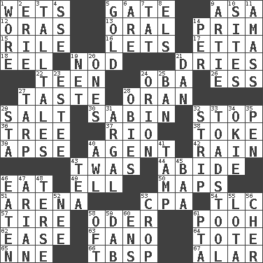 ACROSS 1. Soaks 5. Yard entry 9. White ___ sheet 12. Mouths or openings 13. Taken by mouth 14. Demure 15. Cause heat under the collar 16. Allows 17. Singer James 18. Snakelike fish 19. Dreamland 21. Frees from moisture 22. Adolescent 24. Chief or king in Benin or Nigeria 26. Double-curved letter 27. Clothes sense 28. Northwest Algerian city 29. Table seasoning 30. Unit of acoustic absorption 32. Halt 36. Family _ (genealogy) 37. River (Sp.) 38. Puff or smoke 39. Domed church section 40. Representative 42. Water falling in drops from the sky 43. It was, poetically 44. Remain 46. Erode 49. Pipe bend 50. Atlas contents 51. Sports stadium 53. Numbers guy (abbr.) 54. Affectionate concern, for short 57. Become fatigued 58. Baltic tributary 61. "Silly old bear" 62. Comfort 63. Papal veil 64. Carryall 65. Compass dir. 66. Cook's measure (abbr.) 67. Having or resembling wings DOWN 1. Had on 2. 4th largest of the Great Lakes 3. Baron Munchausen's specialties 4. Compass dir. 5. Precious metal 6. "We ___ not amused" (Victoria) 7. Make lace 8. Raised railways 9. Nick name for Arthur 10. Locates 11. Collect or gather 14. For each 19. Fish or hair follower 20. Washington bills 21. Daniel's nick name 23. First name in cosmetics 24. Greek mythologigal hunter 25. Prohibit 27. Canvas cover 28. Off-Broadway awards 29. R.R. building 31. Therefore, facetiously 32. Long narrow piece of something 33. Inedible or poisonous agaric 34. Migrant worker of the '30s 35. Animal enclosure 40. Leather borer 41. Pack (down) 43. Afternoon social gathering 45. Sound made by sheep 46. Consumed 47. Believer in; advocate of (suffix) 48. Laconic 52. Born 53. Riding implement 55. Globular water bottle used in Asia 56. "Mermaids" star 58. Often (poetically) 59. Apply (a substance) by light strokes 60. Followers of ems 61. Parent Teacher Association (abbr.)
