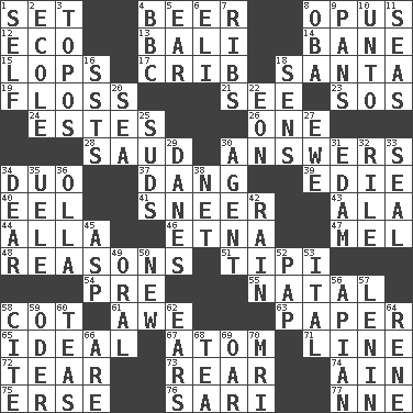 ACROSS 1. Arrange properly for use 4. Fermented drink made from hops 8. Musical composition 12. Environmental prefix 13. Indonesian resort city 14. Object of repulsion 15. Chops off 17. Baby bed with high sides 18. Before Barbara or Clara 19. Soft thread for cleaning between teeth 21. Observe 23. Mayday 24. _____ Park, CO 26. Single 28. Saudi Arabian king (1953-1964) 30. Statements in reply to questions 34. Superhero pair 37. Mild oath, euphamism for damn 39. Singer Brickell 40. Snakelike fish 41. Scornful expression 43. Insect wing 44. Silent film actress Nazimova 46. Inactive volcano in Sicily 47. Cartoonist voice _ Blanc 48. Thinks logically 51. Native american tent (variation) 54. Before (prefix) 55. Relating to or accompanying birth 58. Small bed 61. Deep reverence 63. Some stationery 65. Standard of perfection 67. Tiny particle 71. Actor's bit 72. Rend 73. Buttocks 74. The 18th letter of the Arabic alphabet 75. Celtic language 76. Indian skirt 77. Compass dir. DOWN 1. Oneself 2. Learning spot: Fr. 3. Literary convention 4. English channel? 5. Ewer handle 6. Biblical high priest 7. Teases 8. Chief or king in Benin or Nigeria 9. Baking dishes 10. To (old English) 11. Oceans 16. Fast planes 18. Elected reps. 20. Ocean 22. A really long time 25. Beer foam 27. She-sheep 29. Natives or inhabitants of Denmark 30. Rep 31. Dutch treat 32. Cause heat under the collar 33. Lick closed 34. Letter starter 35. Ubangi River tributary 36. Rounded earthenware pot or jar 38. Fish or hair follower 42. Water falling in drops from the sky 45. Viper 49. Relating to the mouth 50. ___ Haven, CT 52. Infant food 53. Slanted text style (abbr.) 56. Bee-related 57. Soviet premier 1918-24 58. Quote 59. Baltic tributary 60. Afternoon social gatherings 62. Hearing organs 64. French philosopher Descartes 66. "We ___ not amused" (Victoria) 68. Afternoon social gathering 69. Boat paddle 70. Medical imaging device (abbr.)