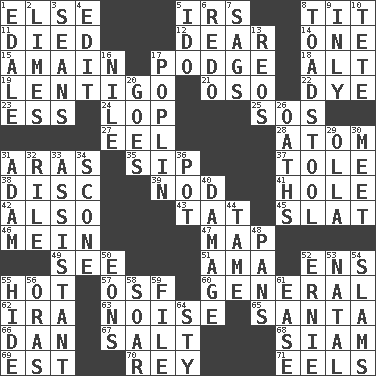 ACROSS 1. Otherwise 5. Big collection agency 8. Teat (slang) 11. Passed on 12. Letter starter 14. Single 15. At full speed 17. Puddle 18. Keyboard modifier key 19. Small, flat, pigmented spot on the skin 21. Bear (Spanish) 22. Color 23. Curvy letter 24. Chop off 25. Mayday 27. Snakelike fish 28. Smallest unit of an element 31. Caspian sea tributary 35. Small drink 37. Lacquered or enameled metalware 38. Compact _ 39. Lower and raise head in agreement 41. Hollow 42. In addition 43. Make lace 45. Narrow board 46. Count _ (2 wds.) 47. Atlas unit 49. Observe 51. Nursemaid (var.) 52. Followers of ems 55. Being at a high temperature 57. Order of Saint Francis (abbr.) 60. Commissioned military rank 62. Lyricist Gershwin 63. Annoying sound 65. Before Barbara or Clara 66. One of the 12 tribes of Israel 67. Table seasoning 68. Thailand, formerly 69. Eastern Standard Time (abbr.) 70. Marina Del _, California 71. Snakelike fish DOWN 1. Peak District village in England 2. Citrus fruits 3. Actors Connery and Penn 4. Prepare for publication 5. Wedding promise 6. Make new 7. Sinks 8. Inedible or poisonous agaric 9. Inwardly 10. Wig 13. Vintage cars 16. The longest river in the world 17. Cotton for raincoats, e.g. 20. Moves 26. Profane or obscene expressions 29. Water jar 30. Confront 31. First of billions? 32. Cause heat under the collar 33. Aide 34. Biscuitlike quick bread 36. Cooking vessel 40. Break 44. Not wild 48. Zero-star reviews 50. Immeasurably long periods of time 52. Bert's buddy 53. Relating to or accompanying birth 54. Criticizes harshly 55. Flintstone garb 56. Mouths or openings 58. Fly high 59. Do some clerical work 61. Comfort 64. Filthy place