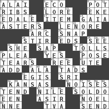ACROSS 1. Jai _ 5. Environmental prefix 8. Plant holder 11. Chest bones 12. Old wives' tales, e.g. 14. Make supply last 15. Peak District village in England 17. Detail 18. Greek goddess of the earth (variant) 19. Michaelmas daisies 21. Poe poem 23. Curve 25. Fastener 26. Agitate 27. Begley and Asner 28. Perceive with the eye 31. A female animal or person 33. Plant excrement 35. For Whom the Bell _____ 37. Entreaty 38. It is so 40. Introduce or present, as a question 41. Rends 43. To riddle 45. Shoshoni 46. Find the sum of 47. Chicken ___ king 50. Bits 52. The front part of a cuirass 53. _ Lanka 54. Sunflower state 56. Annoying sounds 61. Look after 62. Mediterranean tributary 65. Twentieth part of a lira 66. Car or cant ending 67. SW Saudi Arabia district 68. Christmas carol 69. Compass dir. 70. Federal power corp. 71. Transmit DOWN 1. Type of rug 2. Hats (slang) 3. Blind as ____ 4. Small island 5. Biblical high priest 6. Small bed 7. Threatening words 8. Lightbulb-shaped fruit 9. Migrant worker of the '30s 10. Afternoon social gathering 13. Make improvements or corrections to 16. Part of Q.E.F. 18. Republican Party 20. Indian titles of respect 22. Political cartoonist Thomas 24. Supercomputer manufacturer 26. Singe 28. Narrow opening 29. Otherwise 30. Compass dir. 31. Downhill vehicle 32. Froth on beer 34. For each 36. Musical composition 37. Parent Teacher Assoc. 39. Puts into a specified state 42. Sinks 44. Merit 48. Woody, climbing, usually tropical plant 49. Help 51. "Vaya con ____" 52. Conclude 54. Peachy ____! 55. Queen of England 1702-14 57. Charged particles 58. A type of plum 59. Paradise 60. Disposed of to a purchaser 61. "___ Little Indians" 63. 54 in ancient Rome 64. Period