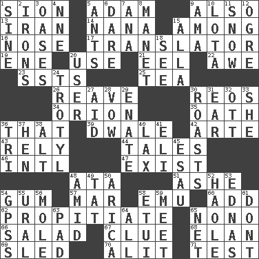 ACROSS 1. The Jewish people; Israel 5. First of billions? 9. In addition 13. SW Asia republic 14. Nanny 15. Amid 16. Characteristic smell of wine 17. Interpreter 19. Compass dir. 20. Purpose 21. Snakelike fish 22. Deep reverence 23. Fast planes 25. Afternoon social gathering 26. Break or tear apart 30. Vintage cars 34. Constellation of myth 35. Pledge 36. Not this but _ 39. A sleeping potion; an opiate (poet.) 42. Johnson of "Laugh-In" 43. Have trust in 44. Lies 46. International (abbr.) 47. Be 48. "One Day ___ Time" 51. American tennis player Robert 54. Chewing product 57. Impair 58. Australian flightless bird 60. Increase 62. Conciliate 65. Words to Nanette 66. First course 67. A slight indication 68. Enthusiasm 69. Downhill vehicle 70. Came down and settled, as after flight 71. Trial DOWN 1. Trig term 2. Removes the wrinkles 3. Fertile tracts in a desert 4. Compass dir. 5. Pismires 6. Have the gumption 7. Santa ___, CA 8. French painter Edouard 9. Housemaid (var.) 10. Globular water bottle used in Asia 11. Overwhelm 12. Legendary monster 15. Silent film actress Nazimova 18. Perceive with the eye 20. One who uses or employs something 24. Trinitrotoluene 27. Assist 28. Solemn pledge 29. Related on the mother's side 30. Cooks with dry heat, as in an oven 31. Hearing organ 32. Baseball player Mel 33. A female animal or person 36. Three (prefix) 37. Layer 38. The first octave above the treble staff 40. Not strict 41. Biblical high priest 45. Son of Isaac 48. Among 49. Make lace 50. N. Chile seaport 52. White Person, in Hawaii 53. Ferber et al. 54. Global Positioning Systems (abbr.) 55. Mountain range 56. Undercover agent 58. Needle holder 59. Confront 61. Do not 63. Writing tablet 64. Everything 65. Fish or hair follower