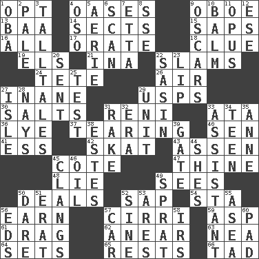 ACROSS 1. Choose 4. Fertile tracts in a desert 9. Mitch Miller's instrument 13. Sound made by sheep 14. Religious groups 15. Plant excrements 16. Everything 17. Declaim 18. A slight indication 19. Raised railways 21. _ tizzy (2 wds.) 22. Shuts with force 24. Wig 26. Atmosphere 27. Empty; void 29. United States Postal Service (abbr.) 30. Table seasonings 31. Painter Guido (1575-1642) 33. "One Day ___ Time" 36. Sodium hydroxide 37. Pulling apart 40. Elected rep. 41. Double-curved letter 42. Three-handed card game 43. NE Netherlands city 45. ____ d'Azur (French Riviera) 47. One or ones belonging to thee 48. Whopper 49. Perceives with the eye 50. Allots cards 52. Plant excrement 54. R.R. building 56. Merit 57. High-altitude cloud 59. Cleo's killer 61. To trail on the ground 62. Approach 63. Teachers' org. 64. Puts into a specified state 65. Musical pauses 66. Bit DOWN 1. Chief or king in Benin or Nigeria 2. Light colored 3. Baron Munchausen's specialties 4. Bear (Spanish) 5. Nest on high 6. Examine minutely or intensely 7. Singer James 8. Compass dir. 9. Motion picture awards 10. Lip ointment 11. Musical composition 12. Compass dir. 20. Transmitted 22. Indian antelope 23. Mouth edge 25. Trial 27. Small island 28. Negative votes 29. A single undivided whole 31. Libertine 32. Period 33. Helper 34. Adolescent 35. Queen of England 1702-14 38. _____ Park, CO 39. Yard entry 44. "______ My Girl" (Turtles hit) 45. Rigngs loudly 46. Petroleum 49. Small fatty European fish 50. Have the gumption 51. Part of Q.E.F. 52. Trig term 53. Ancient Greek god of war 55. Toward the sea 56. Begley and Asner 57. Auto 58. Big collection agency 60. Groovy apt.