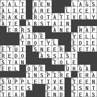ACROSS 1. Table seasoning 5. Benjamin's nick name 8. Falls behind 12. Jai _ 13. "We ___ not amused" (Victoria) 14. It is permitted: Lat. 15. Libertine 16. Happening in regular succession 19. Had dinner 20. Refrain by choice 21. Blunders 23. A saturated hydrocarbon 24. Atlas unit 27. Assistant 30. Shout 31. TNT 34. Singer Brickell 35. Needle case 38. Contemptuous expression 40. Bristle 41. Redecorate 42. Help 44. Comedian Laurel of Laurel & Hardy 45. Lacquered or enameled metalware 46. Snakelike fish 47. Single 50. Capital and largest city of Mongolia 53. Heighten or intensify 57. Epoch 59. Supplementary 63. Adolescent 64. _____ Park, CO 65. Baking dish 66. Is not 67. Separate forcefully 68. Conclude 69. Beverages made from leaves DOWN 1. "Two Mules for Sister ____" 2. Having winglike extensions 3. Member of a famous L.A. basketball team 4. Standoff 5. Sharp remark 6. Greek god of love 7. Remaining after all deductions 8. 54 in ancient Rome 9. Adept person 10. Set 11. Filthy place 14. Actor's bit 17. Auto club (abbr.) 18. Shallow baking pan 20. SW Saudi Arabia district 22. Food allowance for one day 24. Ancient Persian 25. Set down 26. Entreaty 28. Two (Sp.) 29. Inactive volcano in Sicily 30. Next before 32. Consenting reply 33. For fear that 35. Celtic language 36. Wig 37. Freehold land 39. _ de Janeiro 43. Change direction abruptly 47. Petroleums 48. Compass dir. 49. Eastern Standard Time (abbr.) 51. Honkers 52. Sports stadium 54. Corncob 55. _ the terrible 56. Tear apart 58. Pismires 59. Put into a specified state 60. Purpose 61. Parent Teacher Association (abbr.) 62. For each 63. Teat (slang)