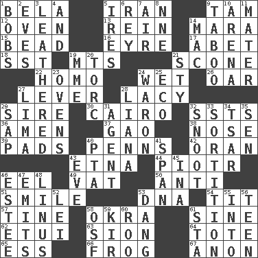 ACROSS 1. Actor Lugosi 5. SW Asia republic 9. Scottish cap 12. Baking chamber 13. It's straight from the horse's mouth 14. Hindu Mythology: god of death 15. Necklace unit 16. Jane of fiction 17. Collude with 18. Fast jet (abbr.) 19. Mountains (abbr.) 21. Biscuitlike quick bread 22. Like (prefix) 24. Dripping 26. Boat paddle 27. Prying instrument 28. Made of lace 29. Title for a man of rank and authority 30. Capital of Egypt 32. Fast planes 36. So be it 37. E Mali city 38. Characteristic smell of wine 39. Groovy apts. 40. Actor Sean's family 42. NW Algerian seaport 43. Inactive volcano in Sicily 44. Peter (Polish) 46. Snakelike fish 49. Large container 50. Against 51. Grin 53. Heredity factor (abbr.) 54. Teat (slang) 57. Prong on a fork 58. Gumbo ingredient 61. Trig term 62. Needle holder 63. The Jewish people; Israel 64. Carry 65. Double-curved letter 66. Tree-dwelling hopper 67. At once, immediately (arch.) DOWN 1. Moves up and down 2. Nights before holidays 3. Tough but pliablecoriaceous 4. Plus 5. Angers 6. Marina Del _, California 7. Atmosphere 8. Compass dir. 9. Off limits 10. Sports stadium 11. Mother 14. Big _ 19. Madame (abbr.) 20. Torque (variant) 21. Filthy place 23. Baking chambers 24. Make _____ (do battle with) 25. Environmental prefix 27. Pale green bean 28. Climbing, woody, usually tropical vines 29. Plant excrement 31. Rep 32. Snob 33. Making a chance decision by using lots 34. Russian ruler of old 35. Elected rep. 40. Parent Teacher Association (abbr.) 41. Connect, as a bridge 43. Night before a holiday 45. _ tizzy (2 wds.) 46. First name in cosmetics 47. Sends forth 48. "_ and Lucy" (Charlie Brown theme song) 52. Luau accessory 53. Mild oath, euphamism for damn 55. To the inside or interior of 56. Adolescent 58. Order of Saint Francis (abbr.) 59. Apertif with cassis 60. Friend of Pooh 61. R.R. building