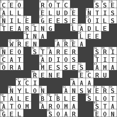 ACROSS 1. Corporate head (abbr.) 4. College mil. group 8. Compass dir. 11. Everything 12. Evade 14. Nuclear Threat Initiatives 15. The longest river in the world 17. Honkers 18. Lubricates 19. Rending 21. Dipping utensil 23. _ tizzy (2 wds.) 24. Area sheltered from the wind 25. Songbird 27. Type of rug 30. Modern: prefix 31. A viewer who gazes fixedly 34. _ Lanka 37. Domesticated feline 38. Goodbye (Sp.) 39. Teat (slang) 40. Mouth or opening 41. Makes clutter 43. Wet nurse (var.) 44. French philosopher Descartes 45. Shade of tan 47. One more than ninety 49. American Automobile Association (abbr.) 50. High-strength synthetic material 52. Responses 56. Lie 57. God's Word 60. Position in a hierarchy or organization 61. Tiny particle 62. Odor 63. R.R. building 64. Set 65. Fly high 66. Age DOWN 1. Patter 2. Writer Wiesel 3. Water jar 4. Canadian anthropologist Darnell 5. Cassini of fashion 6. Third day of the wk. 7. Music discs 8. Vertical member of a panel or frame 9. Drop; flow; fall 10. Curvy letter 13. Snakelike fish 14. Connecting point 16. One of the Great Lakes 20. Lodging establishments 22. Wing 25. Put on (as clothing) 26. Roll call or roster of names 27. Ascend 28. Vintage cars 29. Celtic language 30. Non-commissioned officer (abbr.) 32. Docile 33. Arabian gulf 34. Play the lead 35. Tall New Zealand timber tree 36. Call ___ day 42. Oceans 44. River (Sp.) 46. Crow sounds 47. Xylene (variant) 48. Clement's nick name 49. Approach 50. Nathan's nickname 51. Basketball assoc. 52. _ mater 53. Otherwise 54. Printing process, for short 55. Comedian Laurel of Laurel & Hardy 56. Label 58. Big collection agency 59. Surprise greeting