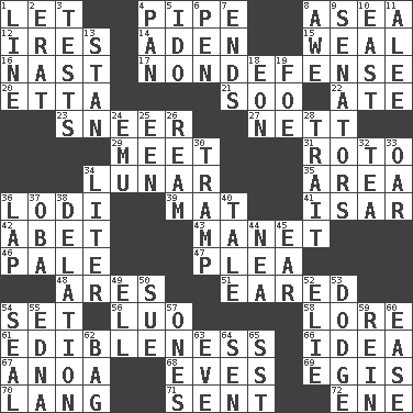 ACROSS 1. Allow 4. Corncob 8. At sea 12. Angers 14. Arabian gulf 15. Welt 16. Political cartoonist Thomas 17. Unrelated to defense, as in spending 20. Singer James 21. "Barney Miller" actor Jack 22. Had dinner 23. Scornful expression 27. Remaining after all deductions 29. Confront 31. Printing process, for short 34. Type of eclipse 35. Length times width 36. Farming town in central California 39. Floor covering 41. Austrian river, tributary to the Danube 42. Collude with 43. French painter Edouard 46. Light colored 47. Entreaty 48. Ancient Greek god of war 51. Having ears or earlike features 54. Arrange properly for use 56. Nilotic language 58. Old wives' tales, e.g. 61. The property of being fit to eat 66. It may be bright or harebrained 67. Small Philippine buffalo 68. Nights before holidays 69. Armor plate that protects the chest 70. Austrian-born American filmmaker Fritz 71. Posted 72. Compass dir. DOWN 1. Actor's bit 2. Part of Q.E.F. 3. Trials 4. Baking dish 5. Wedding promise 6. Fenced enclosure 7. Extremities 8. Deep reverence 9. Legislators 10. Compass direction 11. Toward shelter 13. Comedian Laurel of Laurel & Hardy 18. Age 19. Enemy 24. Australian flightless bird 25. Car or cant ending 26. 480, 500 or 516 sheets of paper 28. Distinguishing feature 30. _____ steamer (cargo ship) 32. Afternoon social gathering 33. Boat paddle 34. 61 cubic inches 36. Pet locale 37. Chief or king in Benin or Nigeria 38. Conveyance 40. Falsehood 44. Teachers' org. 45. Hearing organ 49. Pipe bend 50. Take to court 52. Writer Wiesel 53. Evade 54. Lick closed 55. Pulitzer Prize-winning author Ferber 57. Washington bills 59. It's straight from the horse's mouth 60. Comfort 62. Paper or plastic container 63. Night before a holiday 64. Elected rep. 65. Fast jet (abbr.)