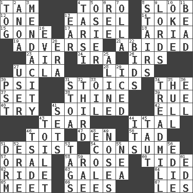 ACROSS 1. Scottish cap 4. "Corrida" creature 8. Messy guy 12. Single 13. Artist's stand 14. Casino tip 15. Went 17. Satellite of Uranus 18. Operatic vocal solo 19. Contrary to your interests or welfare 21. Remained 23. Atmosphere 24. Lyricist Gershwin 26. Big collection agency 27. Southern CA. univ. 28. Hats (slang) 30. Air pressure measure (abbr.) 31. Unemotional ones 34. Definite Article 37. Put into a specified state 38. One or ones belonging to thee 39. Sorrow 40. Attempt to accomplish something 41. Dirtied 42. Pipe bend 43. Separate forcefully 44. Slanted text style (abbr.) 46. Small child 47. Lair 50. Bit 51. Stop 54. Eat 57. Relating to the mouth 58. Came up 60. Event that recurs at intervals 62. Travel on or in a vehicle 63. An organ shaped like a helmet 64. Flaplike covering 65. Rendezvous 66. Perceives with the eye 67. French article DOWN 1. Coat; cloak 2. Small Philippine buffalo 3. Ananias' fault 4. Tarsus (plural) 5. Flexible twig of a willow tree 6. Portuguese money of account (variant) 7. Spanish pot 8. Flight of steps 9. Domineers 10. Migrant worker of the '30s 11. Necklace unit 13. Ewer handle 16. Tending to cause great harm 20. Period 22. Auction offers 25. Place in a line 27. One who makes use of a thing 29. On the rocks 30. Pacific Standard Time (abbr.) 31. Portico 32. One of three equal parts 33. Lubricate 34. Excercise machine 35. Frame or body of a ship 36. Snakelike fish 41. Puts into a specified state 43. Rest room 44. ___ a Wonderful Life 45. Strained 46. Sadhe (variant) 48. Learning spot: Fr. 49. Olfactory organs 51. Dormintory (informal) 52. One of the Great Lakes 53. Labels 55. Teachers' org. 56. Singer Brickell 59. Actress Charlotte 61. Begley and Asner