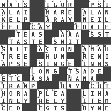 ACROSS 1. Floor coverings 5. Russian composer Stravinsky 9. Air pressure measure (abbr.) 12. Jai ____ 13. Female horse 14. ____ Jay Lerner 15. Seaweed 16. Like ___ of sunshine 17. Famous astronaut Armstrong 18. Snakelike fish 19. Island 21. Peak District village in England 22. Beverages made from leaves 24. Auto club (abbr.) 26. Fast jet (abbr.) 27. Clothes sense 28. Stricken, poetically 29. Table seasoning 30. 13-14th century defensive garment 32. Housemaid 36. Family _ (genealogy) 37. Attila the _ 38. Painter Guido (1575-1642) 39. Domed church section 40. Burn superficially 42. Taverns 43. Protracted 44. Sadhe (variant) 46. And so on (abbr.) 49. White ___ sheet 50. Nanny 51. _____ steamer (cargo ship) 53. 24 hours 54. Small bed 57. Israeli folk dance 58. Entreaty 61. Pale green bean 62. Inwardly 63. Have confidence or faith in 64. A whole individual unit 65. Corporate head (abbr.) 66. The front part of a cuirass 67. Centimeter-gram-second unit of force DOWN 1. Cause to be 2. Toward shelter 3. Baron Munchausen's specialties 4. Small drink 5. "If ____ say so..." 6. Slender fish 7. Mouth or opening 8. Marina Del _, California 9. Entreaties 10. Moves on water 11. An arm off of a larger body of water 14. Also 19. Domesticated feline 20. At sea 21. Erode 23. First name in cosmetics 24. Amid 25. The 18th letter of the Arabic alphabet 27. Canvas cover 28. Feeling sharp psychological pain 29. R.R. building 31. Large country 32. Believer in; advocate of (suffix) 33. Ananias' fault 34. Queen of England 1702-14 35. Part of HMS, perhaps 40. Mayday 41. Inactive volcano in Sicily 43. Infant locale 45. Declare 46. Value system 47. Marketplace scale 48. Monte _, Las Vegas Hotel/Casino 52. Fifth month 53. 24-hour periods 55. Presage 56. Docile 58. Before (prefix) 59. Part of a journey 60. Biblical high priest 61. Flaplike covering