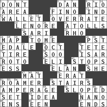 ACROSS 1. Do not 5. Daniel's nick name 8. _ de Janeiro 11. Type of rug 12. A pale, very dry sherry 13. Indiana (abbr.) 14. Place for singles 17. Make much ado about nothing 19. Poe poem 21. Ringlike coral islands and reefs 22. Indian skirt 23. 17th letter of the Greek alphabet 24. Atlas unit 27. Heavy book 29. Pacific Standard Time (abbr.) 32. Peak District village in England 34. Sep. follower 36. Wig 37. Become fatigued 38. "Barney Miller" actor Jack 39. Austrian river, tributary to the Danube 40. Printing process, for short 41. Biblical high priest 42. Halts 43. Curvy letter 44. Style 46. A female animal or person 47. Floor protector 50. Part of Q.E.F. 52. Nomad 55. Flight of steps 57. Electrical Measurement 59. Inclined 62. Arrange properly for use 63. The content of cognition 64. Billionth: prefix 65. Followers of ems 66. Car or cant ending 67. Conclusions DOWN 1. Obsolete 2. Mouth or opening 3. 1994 drama film starring Jodie Foster 4. Stories 5. HTML Container Element 6. Approach 7. 0 degrees 8. Monetary unit of Yemen 9. International (abbr.) 10. Lyric poems 12. Enemy 15. Maternal 16. "Corrida" creature 18. Friend of Pooh 20. Full of chinks, cracks, or crevices 24. Distance measurement (Brit.) 25. Goodbye (Sp.) 26. Actors' quests 28. Learning spot: Fr. 29. Mexican monetary units 30. Staphylococcus 31. Laconic 33. Lion 35. Bathroom plumbing fixture 36. Teat (slang) 42. Slow-paced one 45. Ancient river in northeast Turkey 47. Madame (abbr.) 48. Nest on high 49. Buy and sell 51. Heavy duty weighing machine 52. To erase 53. Sign of things to come 54. Tenement units (abbr.) 55. Ocean 56. Connect, as a bridge 58. Commissioned mil. rank 60. Conclusion 61. Two (Sp.)