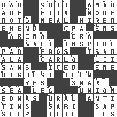 ACROSS 1. Male parent 4. Set of matching outer garments 8. Housemaid 12. "We ___ not amused" (Victoria) 13. Singer James 14. Connecting point 15. Printing process, for short 17. Actress Patricia 18. One who wires 19. Make improvements or corrections to 21. Tax preparer (abbr.) 23. Followers of ems 24. Sports stadium 26. Period 28. Table seasoning 30. Stimulate to action 34. Groovy apt. 37. Greek god of love 39. Russian ruler of old 40. Chicken ___ king 41. Monte _, Las Vegas Hotel/Casino 43. Cards in a Roman deck? 44. Without 46. On the rocks 47. Compass dir. 48. Having the greatest elevation 51. Adolescent 54. Consenting reply 55. Don Adams' spy role 58. Ocean 61. Part of a journey 63. The state of being joined or united 65. Ferber et al. 67. Mountain range 71. Against 72. Airtight sealed metal containers 73. Indian skirt 74. Plant excrement 75. Ooze 76. False hair 77. Raised railways DOWN 1. Have the gumption 2. Scent 3. Prevent from occurring 4. Elected rep. 5. Shoshoni 6. Call ___ day 7. Baby powder 8. Black tropical American cuckoo 9. Greater amount 10. Arabian gulf 11. Possessive pronoun 16. Washington bills 18. Armed conflicts 20. Heredity factor (abbr.) 22. Fenced enclosure 25. Actor Baldwin 27. Fitting 29. Distinguishing feature 30. Small island 31. Small island 32. Precipitation 33. 4th largest of the Great Lakes 34. Romantic infatuation 35. Jai _ 36. Mild oath, euphamism for damn 38. The grampus (Milton) 42. Lyric poems 45. Like a shrinking violet 49. Snakelike fish 50. Compass dir. 52. Australian flightless bird 53. Grandmother 56. Wash lightly 57. Add up to 58. Arranges properly for use 59. Singer Brickell 60. Queen of England 1702-14 62. Abrupt rush of wind 64. Pinches, bites 66. Cleo's killer 68. Actress Charlotte 69. Nonscientific branch of learning 70. Falsehood