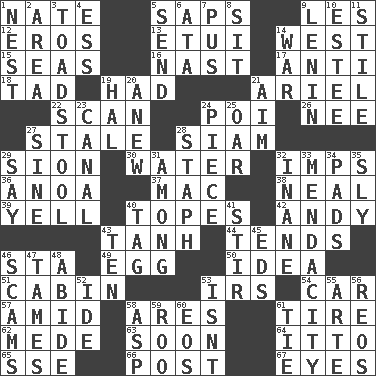 ACROSS 1. Nathan's nickname 5. Plant excrements 9. French article 12. Greek god of love 13. Needle holder 14. Compass direction 15. Oceans 16. Political cartoonist Thomas 17. Opposed to 18. Small amount or degree 19. Possessed 21. Satellite of Uranus 22. Skim 24. Luau course 26. Born 27. Showing deterioration from age 28. Thailand, formerly 29. The Jewish people; Israel 30. Wetness 32. Naughty children 36. Small Philippine buffalo 37. Apple computer (short form) 38. Actress Patricia 39. Shout 40. Drinks excessively 42. "60 Minutes" Commentator Rooney 43. Hyperbolic tangent 44. Is inclined (to) 46. R.R. building 49. Oval reproductive body of a fowl 50. The main thing one is thinking about 51. Apartment or room in a ship 53. Big collection agency 54. Auto 57. Among 58. Ancient Greek god of war 61. Hoop that covers a wheel 62. Ancient Persian 63. Within a short period 64. "Tell ____ the Marines!" 65. Compass dir. 66. Mail 67. Sight organs DOWN 1. A home for chicks 2. Length times width 3. Inedible or poisonous agaric 4. Curvy letter 5. Transmit 6. "One Day ___ Time" 7. Fluid product of inflammation 8. Be seated 9. Soviet premier 1918-24 10. First name in cosmetics 11. Vertical member of a panel or frame 14. Armed conflict 19. Actor Linden 20. Afresh 21. Direct toward a target or goal 23. Lessep's creation 24. Component 25. Boat paddle 27. Trig term 28. Staphylococcus 29. Declare 31. Amid 32. Lacking in sense or substance 33. Ananias' fault 34. Groovy apts. 35. Mischievous 40. Label 41. Use a swizzle stick 43. "___ Little Indians" 45. Begley and Asner 46. Fraudulent business schemes 47. Softens 48. Remain 52. Binary compound 53. Is not 55. Johnson of "Laugh-In" 56. Vintage cars 58. Cleo's killer 59. Friend of Pooh 60. Greek goddess of the dawn 61. Neckwear
