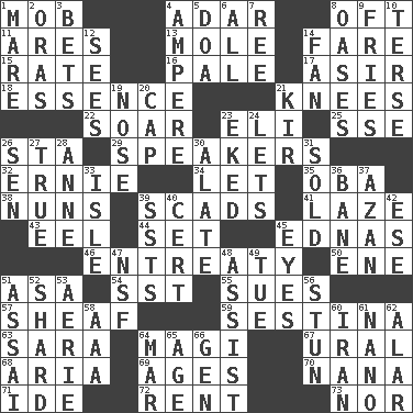 ACROSS 1. Disorderly crowd 4. The sixth month of the Jewish calendar 8. Often (poetically) 11. Ancient Greek god of war 13. Undercover agent 14. Conductor's collection 15. Assign a rank or rating to 16. Diluted with white 17. SW Saudi Arabia district 18. Substance 21. Leg joints 22. Fly high 23. Connecticut Ivy Leaguer 25. Compass dir. 26. R.R. building 29. Orators 32. Bert's buddy 34. Allow 35. Chief or king in Benin or Nigeria 38. Religious women 39. Oodles 41. Goldbrick 43. Snakelike fish 44. Put into a specified state 45. Ferber et al. 46. Plea 50. Compass dir. 51. White ___ sheet 54. Fast jet (abbr.) 55. Takes to court 57. Bundle of cut stalks of grain 59. French poetic form 63. "Two Mules for Sister ____" 64. Wise men 67. Mountain range 68. Roberta Peters solo 69. Eras 70. Grandmother 71. Binary compound 72. Monthly bill 73. And not DOWN 1. Female horse 2. Mouths or openings 3. Stakes 4. Electrical Unit 5. ___ good deed 6. 100% 7. To sift 8. Fertile tracts in a desert 9. Strips of potato fried in deep fat 10. Laconic 12. Observes 14. Avid follower 19. Characteristic smell of wine 20. Head covering 21. Apertif with cassis 23. Made supply last 24. Allows 26. Elected rep. 27. Loyal 28. Queen of England 1702-14 30. Having winglike extensions 31. Exchanged or delivered for money 33. Capri or Wright 36. Object of repulsion 37. Muslim summons to prayer 39. Fast planes 40. An absolute certainty 42. Compass dir. 45. Sight organs 47. Overdraft (abbr.) 48. Aid 49. Third day of the wk. 51. Slender Brazilian palm 52. Pottery fragment 53. Nest on high 56. Astound 58. American Automobile Association (abbr.) 60. SW Asia republic 61. Billionth: prefix 62. Having or resembling wings 64. Impair 65. Mature 66. Commissioned military rank (abbr.)