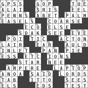 ACROSS 1. Global Positioning Systems (abbr.) 5. Republican Party 8. Third day of the wk. 11. Jai _ 12. Indian titles of respect 14. Snakelike fish 15. Actor Sean's family 17. Collude with 18. Inside of hand 19. Artist's stands 21. Unrefined 23. Environmental prefix 25. Otherwise 26. Neighbor of Neb. 27. Perceive with the eye 28. Night before a holiday 31. Luau course 33. Nervous spasm 35. 13-14th century defensive garment 37. Den 38. Ewer handle 40. Old (Scot.) 41. An arm off of a larger body of water 43. Baking dish 45. Sliced dessert 46. Double-curved letter 47. And so on (abbr.) 50. Charged atoms 52. Play the lead 53. Born 54. Electrical Unit 56. Portable computer 61. Small Philippine buffalo 62. Expressed in words 65. Nobles 66. Keyboard key 67. "Tell ____ the Marines!" 68. Perceives with the eye 69. Raised railways 70. Begley and Asner 71. Trial DOWN 1. Stare wonderingly 2. Entreaty 3. Without 4. Trig term 5. Girls' org. (abbr.) 6. Globe 7. Components 8. Afternoon social gatherings 9. Ubangi River tributary 10. Shade tree 13. Took without asking 16. Downhill vehicle 18. Before (prefix) 20. Go away! 22. Toward the sea 24. Migrant worker of the '30s 26. Title for a man of rank and authority 28. Needle holder 29. Grand slam 30. Conclude 31. Baking dishes 32. Petroleums 34. Head covering 36. Smile enhancers 37. Whopper 39. Water falling in drops from the sky 42. Wig 44. Christmas carol 48. Tarsus (plural) 49. Cause to be 51. Actress Patricia 52. Health resort 54. Of or related to the anus 55. Disorderly crowds 57. Mail 58. Family _ (genealogy) 59. Lyric poems 60. Inconspicuous attention getter 61. Had dinner 63. It would 64. Two (Sp.)