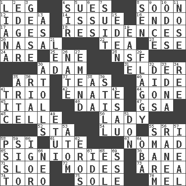 ACROSS 1. Part of a journey 4. Institutes legal proceedings 8. Within a short period 12. The content of cognition 14. Come out of 16. Inside; within (prefix) 17. Eons 18. Homes 20. Relating to the nose 22. Beverage made from leaves 23. Compass dir. 24. "We ___ not amused" (Victoria) 25. Compass dir. 28. Science/research agcy. 30. First man 31. A person who is older than you are 35. Tate display 37. Afternoon social gatherings 40. Assistant 41. Musical group of three 42. Related on the mother's side 44. Went 45. Slanted text style (abbr.) 46. Raised platform 47. Girls' org. (abbr.) 48. Cell (Danish) 50. Kenny Rogers chart-topper in '80 52. R.R. building 54. Nilotic language 55. _ Lanka 58. Air pressure measure (abbr.) 61. Shoshoni 63. Roamer 65. Seigniories (variant) 70. Object of repulsion 71. _ gin 72. Methods 73. Type of rug 74. "Corrida" creature 75. Not divided or shared with others 76. Cartoonist voice _ Blanc DOWN 1. Climbing, woody, usually tropical vines 2. _ Allan Poe 3. Honkers 4. Title for a knight 5. Purpose 6. Double-curved letter 7. Costume for a special activity 8. Elected rep. 9. At one time in the past 10. Lyric poems 11. Characteristic smell of wine 13. White ___ sheet 15. Genesis locale 19. Relaxation 21. Directed 26. Nathan's nickname 27. Make improvements or corrections to 29. Tasteless 30. Ringlike coral islands and reefs 32. "Vaya con ____" 33. Pulitzer Prize-winning author Ferber 34. To sift 35. Johnson of "Laugh-In" 36. Monetary unit of Yemen 38. American Automobile Association (abbr.) 39. Free from disturbance or agitation 41. Nervous spasm 43. He sold his birthright 49. Needle case 51. Spanish title 53. Tiny particle 55. Excessive but superficial compliments 56. The wife of a rajah (variant) 57. Perfect 58. Inconspicuous attention getter 59. Grain storage tower 60. Composer Stravinsky 62. Greek god of love 64. Chief or king in Benin or Nigeria 66. Modern: prefix 67. Wedding promise 68. Snakelike fish 69. Compass dir.