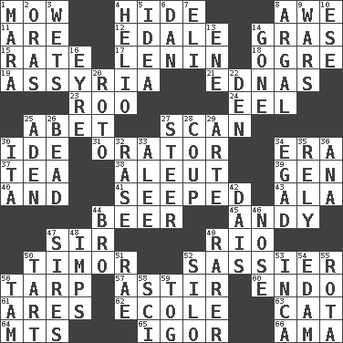 ACROSS 1. Cut the grass 4. Flintstone garb 8. Deep reverence 11. "We ___ not amused" (Victoria) 12. Peak District village in England 14. Pate de foie ____ 15. Assign a rank or rating to 17. Soviet premier 1918-24 18. Legendary monster 19. Nineveh was its capital 21. Ferber et al. 23. Friend of Pooh 24. Snakelike fish 25. Collude with 27. Examine hastily 30. Binary compound 31. Speaker 34. Epoch 37. Beverage made from leaves 38. Native American of Southwest Alaska 39. Commissioned mil. rank 40. Also 41. Oozed 43. Chicken ___ king 44. Fermented drink made from hops 45. "60 Minutes" Commentator Rooney 47. Title for a knight 49. _ de Janeiro 50. The easternmost of the Lesser Sundas 52. More lively and spirited 56. Canvas cover 57. Having gotten out of bed 60. Inside; within (prefix) 61. Ancient Greek god of war 62. Learning spot: Fr. 63. Feline 64. Mountains (abbr.) 65. Composer Stravinsky 66. Nursemaid (var.) DOWN 1. Hindu Mythology: god of death 2. Mouths or openings 3. Moistens 4. Sun: prefix 5. It may be bright or harebrained 6. One of the 12 tribes of Israel 7. Biblical high priest 8. Therefore, facetiously 9. Armed conflicts 10. Compass dir. 13. Compass dir. 14. Went 16. Jane of fiction 20. Printing process, for short 22. Lair 25. Arabian gulf 26. Necklace unit 27. Navigate 28. Clever action or accomplishment 29. Johnson of "Laugh-In" 30. Call ___ day 32. To erase 33. Toward shelter 34. Mild oath 35. Depend 36. Santa ___, CA 42. Raised platform 44. Sis' sibling 46. Olfactory organ 47. Fathers 48. Naughty children 49. Less widely known 50. Small pie 51. Actress Charlotte 52. Grain storage tower 53. South American Indian 54. Dutch treat 55. Round or rotation of duties 56. Scottish cap 58. _-fi 59. Coat; cloak