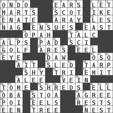 ACROSS 1. Southwest Nigerian state 5. Hearing organs 9. Allow 12. Shops 14. Native of Scotland 15. D.D.E's nickname 16. Related on the mother's side 17. Like ___ of sunshine 18. French article 19. Tired old horse 20. Takes place subsequently 23. Compass direction 24. Brightly colored fish 25. Baby powder 27. High mountains 30. Writing tablet 32. _-fi 33. Eighteen holes 34. Ancient Greek god of war 36. Snakelike fish 38. Sight organ 39. Simpleton 40. Bear (Spanish) 43. Small island 46. Downhill vehicle 48. Canvas cover 49. Like a shrinking violet 51. Three (prefix) 52. Give off 53. Toward shelter 54. Distinctive style or manner 56. Heavy book 58. Tears up 61. Pipe bend 64. Chief or king in Benin or Nigeria 65. Portico 66. Match 68. Luau course 69. Snakelike fish 70. Musical pauses 71. Car or cant ending 72. Relationship diagram 73. Egg locale DOWN 1. Presage 2. Nanny 3. To draw with force 4. Baseball player Mel 5. Son of Isaac 6. 43,560 square feet 7. Cooks with dry heat, as in an oven 8. Filthy place 9. Pale purple color 10. Supplements with great effort 11. Trial 13. Ooze 21. California wine valley 22. Broken pieces 23. Writer Wiesel 24. Order of Saint Francis (abbr.) 26. Adept person 27. Mature 28. Myrna of the movies 29. Entreaty 31. Started a card game 35. Turn aside suddenly 37. Rich soil 41. _ Lanka 42. Elect 44. Capri or Wright 45. Definite Article 47. Passed on 48. Nine, plus one 50. Last past 53. With great haste 55. Austrian river, tributary to the Danube 56. Drink excessively 57. Mitch Miller's instrument 59. Hollow 60. To erase 61. Celtic language 62. Allows 63. For fear that 65. Put into a specified state 67. Commissioned military rank (abbr.)