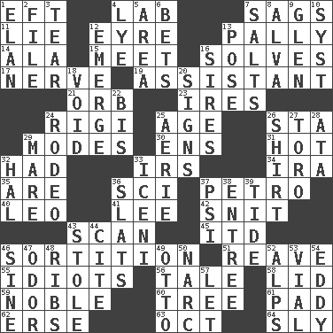 ACROSS 1. Lizard (obsolete) 4. Experiment locale 7. Droops 11. Falsehood 12. Jane of fiction 13. Chummy 14. Wing 15. Confront 16. Finds the solution 17. Effrontery 19. Aide 21. Globe 23. Angers 24. Swiss mountan, "Queen of the Mountains" 25. Ripen 26. R.R. building 29. Methods 30. Followers of ems 31. Being at a high temperature 32. Possessed 33. Big collection agency 34. Retirement account (abbr.) 35. "We ___ not amused" (Victoria) 36. _-fi 37. Stone: prefix 40. Lion 41. Area sheltered from the wind 42. In a ____ (agitated or irritated) 43. Skim 45. It would 46. Making a chance decision by using lots 51. Rob, plunder, or pillage 55. Foolish or stupid persons 56. Falsehood 58. Flaplike covering 59. Impressive in appearance 60. Family _ (genealogy) 61. Writing tablet 62. Celtic language 63. Sep. follower 64. Secret DOWN 1. Style 2. Do some clerical work 3. Rend 4. Sodium hydroxide 5. Type of rug 6. Antes 7. Table seasonings 8. Inventor's middle name 9. Small, secluded valley 10. System (abbr.) 12. Develop 13. Introduce or present, as a question 16. Fathers 18. Empty area or space 20. Signals 22. Twice 24. Cowboy competition 25. Nest on high 26. Chest covering 27. "Corrida" creature 28. "One Day ___ Time" 29. Female horse 32. Actor Linden 33. Ancient Celtic tribe of eastern Britain 36. Narrow boards 37. 23rd letter of the Greek alphabet 38. Main course 39. Periodic rise and fall of the sea level 43. Took without asking 44. Quote 46. Trig term 47. Aroma 48. Teases 49. "Beetle Bailey" pooch 50. Drug cop 52. High mountains 53. Small bottle 54. Whirlpool 57. Allow