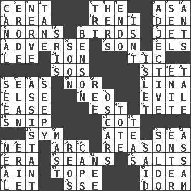 ACROSS 1. Penny 5. Definite Article 8. White ___ sheet 11. Type of rug 12. Painter Guido (1575-1642) 14. Lair 15. Typical standards 17. Avian creatures 18. _ stream 19. Contrary to your interests or welfare 21. Male child 22. Raised railways 23. Area sheltered from the wind 24. Electrically charged atom 25. Nervous spasm 27. Mayday 28. Proofreading order 31. Oceans 35. Not either 37. Pale green bean 38. Otherwise 39. Modern: prefix 41. Tending to cause great harm 42. Relaxation 43. Eastern Standard Time (abbr.) 45. False hair 46. Clip 47. Small bed 49. Symbol (abbr.) 51. Had dinner 52. Ocean 55. Fish or hair follower 57. Curve 60. Thinks logically 62. Period 63. Seines 65. Table seasonings 66. The 18th letter of the Arabic alphabet 67. Drink excessively 68. The content of cognition 69. Allow 70. Compass dir. 71. Dormintory (informal) DOWN 1. Lessep's creation 2. Wear away 3. Effrontery 4. Not wild 5. Three (prefix) 6. Possessive pronoun 7. Inside; within (prefix) 8. Descriptive word 9. Sew up the eyelids of hawks and falcons 10. Pismires 13. Is not 16. Indian titles of respect 17. Gillaume's butler role 20. Within a short period 26. Small island 29. Give off 30. Falsehood 31. Perceives with the eye 32. Liveliness 33. Helper 34. Not well drained, as in land 36. To sift 40. Motion picture awards 44. Haul 48. Beverages made from leaves 50. Vertical spar for supporting sails 52. Twentieth part of a lira 53. Keyboard key 54. Indian state 55. Actress Patricia 56. 4th largest of the Great Lakes 58. Vintage cars 59. Smile enhancers 61. Stated 64. Born