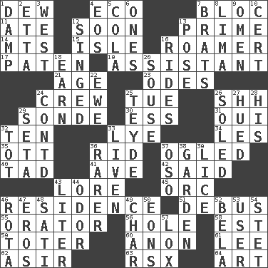 ACROSS 1. Morning condensation 4. Environmental prefix 7. Group of countries in special alliance 11. Had dinner 12. Within a short period 13. First class 14. Mountains (abbr.) 15. Capri or Wright 16. Wanderer 17. Eucharist need 19. Aide 21. Personal question 23. Lyric poems 24. Group working together 25. Third day of the wk. 26. Quiet! 29. Something which is sent 30. Curvy letter 31. Fr. "Yes" 32. Nine, plus one 33. Potassium hydroxide 34. French article 35. Baseball player Mel 36. To free from 37. Stared at amorously 40. Small amount or degree 41. "___ Maria" 42. Expressed in words 43. Old wives' tales, e.g. 45. The grampus (Milton) 46. Dwelling 51. Alight from a bus 55. Speaker 56. Hollow 58. Eastern Standard Time (abbr.) 59. Carrier 60. At once, immediately (arch.) 61. Area sheltered from the wind 62. SW Saudi Arabia district 63. Acura sports coupe 64. Nonscientific branch of learning DOWN 1. Moist 2. Singer James 3. Compass direction 4. Greek goddess of the dawn 5. Root beer relative 6. Washington bills 7. Naughty children 8. Pale green bean 9. Sign of something about to happen 10. Sure thing 12. Burned superficially 13. Introduce or present, as a question 16. Amusement-park features 18. Merit 20. Boozer 22. She-sheep 24. Continued (abbr.) 25. Miss Universe 1986, Barbara Palacios _ 26. Having a sole or soles 27. Became colored 28. Part of HMS, perhaps 29. Bristle 32. Small child 33. Make or become more lively 36. Less widely known 37. Bear (Spanish) 38. Place where plants grow 39. Louse (plural) 43. 61 cubic inches 44. Scent 46. Round or rotation of duties 47. Greek god of love 48. Suttee (variant) 49. Burn to charcoal 50. Immeasurably long periods of time 52. Actor Lugosi 53. One who makes use of a thing 54. Proofreading order 57. Brine-cured salmon