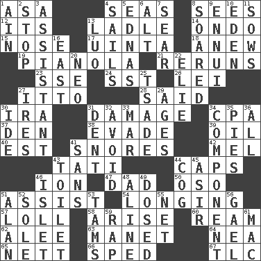 ACROSS 1. White ___ sheet 4. Oceans 8. Perceives with the eye 12. ___ a Wonderful Life 13. Dipping utensil 14. Southwest Nigerian state 15. Sense of smell 17. National forest in Provo, Utah 18. Afresh 19. Player piano 21. Summer TV shows 23. Compass dir. 24. Fast jet (abbr.) 26. Luau accessory 27. "Tell ____ the Marines!" 28. Expressed in words 30. Retirement account (abbr.) 31. Break 34. Numbers guy (abbr.) 37. Lair 38. Dodge 39. Lubricate 40. Eastern Standard Time (abbr.) 41. Sounds asleep 42. Cartoonist voice _ Blanc 43. Jacques of French films 44. Balmoral and tarboosh 46. Electrically charged atom 47. June honoree 50. Bear (Spanish) 51. Help 54. Yearning 57. Hang loosely or laxly 58. Originate 60. 480, 500 or 516 sheets of paper 62. Toward shelter 63. French painter Edouard 64. Teachers' org. 65. Remaining after all deductions 66. Moved rapidly 67. Affectionate concern, for short DOWN 1. The 18th letter of the Arabic alphabet 2. Halt 3. Helper 4. Moves on water 5. Ferber et al. 6. The first octave above the treble staff 7. Shrivel 8. Flew 9. World-weariness 10. Genesis locale 11. Sty mamas 13. Nilotic language 16. 90 degrees 20. Modern: prefix 22. Writer Wiesel 25. Sadhe (variant) 27. Angers 29. Matures 30. Binary compound 31. Gouge 32. Prevent from happening 33. Third mo. 34. Part 35. Sliced desserts 36. 100% 41. Without 43. Rest room 44. Gear tooth 45. SW Saudi Arabia district 46. Small island 48. Place in a line 49. Administered medicine 51. Actor Alda or Thicke 52. Flatfish 53. Scottish caps 55. Fish or hair follower 56. Highlander 59. Strike 61. Apple computer (short form)