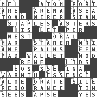 ACROSS 1. Cartoonist voice _ Blanc 4. Tiny particle 8. Sweet dark-red dessert wine 12. "We ___ not amused" (Victoria) 13. Sports stadium 14. At sea 15. Frog relative 17. One who wires 18. Thailand, formerly 19. Paper fasteners 21. Michaelmas daisies 23. Part of HMS, perhaps 24. Allow 26. For each 27. Egg locale 28. Of the mouth 30. Make imperfect 31. A viewer who gazes fixedly 34. Medical imaging device (abbr.) 37. A saturated hydrocarbon 38. Insides of hands 39. Car or cant ending 40. Writing tablet 41. Place for singles 42. Lower and raise head in agreement 43. French philosopher Descartes 44. Flaplike coverings 46. Greek goddess of the dawn 47. Compass dir. 50. _ tizzy (2 wds.) 51. Heat 54. Substance 57. Medicinal plant 58. Declaim 60. Filth; sediment 62. Redecorate 63. Indian princess (variant) 64. Shallow baking pan 65. Observes 66. Domed church section 67. It is so DOWN 1. Floor protector 2. Greek god of love 3. Resembling or made to resemble leather 4. Satellite of Uranus 5. Laconic 6. Single 7. Hindu Mythology: god of death 8. Soft color 9. Flexible twig of a willow tree 10. Bring up, as a child 11. Scottish caps 13. Leather borer 16. Raised platform 20. Pacific Standard Time (abbr.) 22. Practice fight 25. Singer Mel 27. Grandmother 29. Relief 30. Atlas unit 31. Connect, as a bridge 32. Falsehoods 33. Everything 34. Ananias' fault 35. Vintage cars 36. Indiana (abbr.) 41. 270 degrees 43. Lover boys 44. Whopper 45. Lodging establishments 46. Eat (away) 48. Seines 49. First name in cosmetics 51. Armed conflicts 52. Toward shelter 53. Israeli folk dance 55. Perceive with the eye 56. Writer Wiesel 59. Hit sharply and swiftly 61. Followers of ems