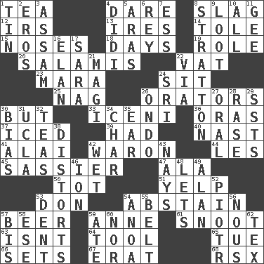 ACROSS 1. Afternoon social gathering 4. Have the gumption 8. Volcanic refuse 12. Big collection agency 13. Angers 14. Lacquered or enameled metalware 15. Olfactory organs 18. 24-hour periods 19. Hero or heavy, e.g. 20. Deli grouping 22. Large container 23. Hindu Mythology: god of death 24. Be seated 25. Tired old horse 26. Speakers 30. Yet 33. Ancient Celtic tribe of eastern Britain 36. Mouths or openings 37. On the rocks 39. Possessed 40. Political cartoonist Thomas 41. Jai _ 42. Make _____ (do battle with) 44. French article 45. More lively and spirited 47. Chicken ___ king 50. Small child 51. Sharp bark 53. Spanish title 54. Choose not to consume 57. Fermented drink made from hops 59. Queen of England 1702-14 61. Snob 63. Is not 64. Implement 65. Third day of the wk. 66. Puts into a specified state 67. Part of Q.E.F. 68. Acura sports coupe DOWN 1. Metal container 2. Greek god of love 3. Indian state 4. "You Light Up My Life" star Conn 5. Caspian sea tributary 6. Marina Del _, California 7. Double-curved letter 8. Ski resort town in Vermont 9. Spoils 10. Everything 11. Unit of force equal to gravity 16. Enthusiasm 17. "Two Mules for Sister ____" 21. Wise men 22. By way of 24. Indian title of respect (Mr.) 26. Southwest Nigerian state 27. Taken by mouth 28. Raze (variant) 29. Fast planes 30. Prejudice 31. Southern CA. univ. 32. Beverages made from leaves 34. Burn to charcoal 35. Hearing organ 38. What propaganda does 42. Dripping 43. Negative votes 46. Electrically charged atom 48. Allows 49. ____ Jay Lerner 52. Peter (Polish) 53. Incision 54. Small Philippine buffalo 55. Waist strap 56. Good sense 57. Twice 58. Compass dir. 59. Had dinner 60. Not either 62. John Ritter's dad