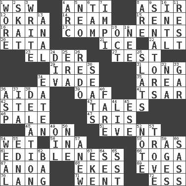 ACROSS 1. Compass dir. 4. Against 8. SW Saudi Arabia district 12. Gumbo ingredient 14. 480, 500 or 516 sheets of paper 15. French philosopher Descartes 16. Precipitation 17. Parts 20. Singer James 21. Frozen water 22. Keyboard modifier key 23. A person who is older than you are 27. Trial 29. Angers 31. Protracted 34. Dodge 35. Length times width 36. Opera by Verdi 39. Clumsy lout 41. Russian ruler of old 42. Proofreading order 43. Lies 46. Light colored 47. Indian titles of respect 48. At once, immediately (arch.) 51. Incident 54. Dripping 56. _ tizzy (2 wds.) 58. Mouths or openings 61. The property of being fit to eat 66. Ancient Roman robe 67. Small Philippine buffalo 68. Supplements with great effort 69. Nights before holidays 70. Long (Scottish) 71. Gone 72. Curvy letter DOWN 1. Had on 2. Three-handed card game 3. Compose 4. Curve 5. Modern: prefix 6. Scottish cap 7. Body of Kaffir warriors 8. "We ___ not amused" (Victoria) 9. Legislators 10. International (abbr.) 11. State of inaction 13. Of or related to the anus 18. Sep. follower 19. Born 24. HTML Container Element 25. Epoch 26. Redecorate 28. Narrow boards 30. Theater features 32. Teachers' org. 33. Slender fish 34. Ingested 36. Viper 37. Call ___ day 38. Conveyance 40. Conductor's collection 44. 54 in ancient Rome 45. Compass dir. 49. Lubricate 50. Compass dir. 52. Observe 53. Collection of objects 54. Welt 55. Pulitzer Prize-winning author Ferber 57. Afresh 59. Ripens 60. Backtalk 62. Paper or plastic container 63. Make supply last 64. Elected rep. 65. Fast jet (abbr.)