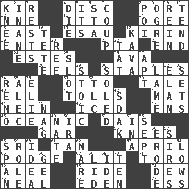 ACROSS 1. Apertif with cassis 4. Flat circle 8. Left side of a ship or aircraft 12. Compass dir. 13. "Tell ____ the Marines!" 14. Double curve, resembling the letter S 15. 90 degrees 17. Son of Isaac 18. Japanese brewing company 19. Keyboard key 21. Parent Teacher Assoc. 23. Conclusion 24. _____ Park, CO 26. Actress Gardner 28. Snakelike fish 30. Paper fasteners 34. Actress Charlotte 37. "Beetle Bailey" pooch 39. Falsehood 40. Pipe bend 41. For Whom the Bell _____ 43. Floor protector 44. Chow _ 46. On the rocks 47. Followers of ems 48. Pertaining to the sea 51. Raised platform 54. Slender fish 55. Leg joints 58. _ Lanka 61. Scottish cap 63. Showery time 65. Puddle 67. Set down 71. "Corrida" creature 72. Toward shelter 73. Travel on an animal 74. Morning condensation 75. Be tempered by heat 76. Locale of original sin 77. Curvy letter DOWN 1. Leg joint 2. Silly 3. Musical pauses 4. Expire 5. It is 6. R.R. building 7. Overturn; upset 8. Luau course 9. Legendary monster 10. It's straight from the horse's mouth 11. Be inclined (to) 16. Wig 18. Polynesian shrub of the pepper family 20. Portuguese money of account (variant) 22. Make lace 25. Narrow, elongated depression 27. Fitting 29. Unemotional 30. Having a sole or soles 31. Unable to walk 32. Enthusiasm 33. Arranges properly for use 34. San ____ (Riviera town) 35. Actor Baldwin 36. Writer Wiesel 38. Affectionate concern, for short 42. Neighbor of Neb. 45. Tired old horse 49. Nathan's nickname 50. Retirement account (abbr.) 52. _ tizzy (2 wds.) 53. Back-to-school mo. 56. Wear away 57. Titles for men of rank and authority 58. Connect, as a bridge 59. Hero or heavy, e.g. 60. It may be bright or harebrained 62. Female horse 64. Moos 66. Set 68. Flaplike covering 69. Binary compound 70. "___ Little Indians"