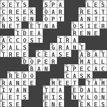 ACROSS 1. Arranges properly for use 5. Health resort 8. French article 11. Small stream 13. Boat paddle 14. Repose 15. NE Netherlands city 16. Elect 17. Opposed to 18. Fish or hair follower 19. Inactive volcano in Sicily 21. Flexible twig of a willow tree 22. The content of cognition 24. French philosopher Descartes 25. Buttonhole 27. Retirement account (abbr.) 29. Friends 30. Let have 32. Woody plant 33. Desist 35. Blind as ____ 39. Drug addict 41. Shopping center 42. Prohibit 43. Medicinal drug used to evoke vomiting 45. Do over again 48. Keg 49. Indian princess (variant) 50. Confront 52. Scottish cap 55. "Terrible" tsar 56. Beverage made from leaves 57. Peak District village in England 59. Allows 60. Part of HMS, perhaps 61. Thermoplastic polyamide 62. Compass dir. 63. Compass dir. 64. Makes supply last DOWN 1. Glance over 2. Celtic language 3. A testis 4. Perceive with the eye 5. Within a short period 6. Dad 7. Nonscientific branch of learning 8. Soviet premier 1918-24 9. First name in cosmetics 10. Move through with a circular motion 12. Leg joints 14. Raze (variant) 20. Make lace 21. Northwest Algerian city 23. Administered medicine 25. Fitting 26. 4-wheeled motor vehicle 27. Big collection agency 28. Actress Charlotte 30. Slender fish 31. Softens 33. Numbers guy (abbr.) 34. Car or cant ending 36. Sass 37. Chicken ___ king 38. Affectionate concern, for short 40. Mitch Miller's instrument 43. Frozen water 44. Eucharist need 45. All-night dance parties 46. Maternal 47. Habitations of wild animals 49. Cause heat under the collar 50. Chow _ 51. Comfort 53. Medicinal plant 54. Not women's 56. Definite Article 58. Color