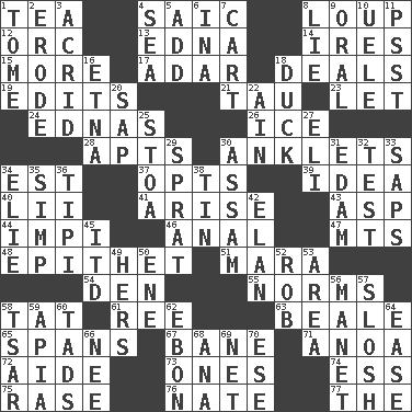 ACROSS 1. Afternoon social gathering 4. Ketch in the Levant 8. Central Nebraska county 12. The grampus (Milton) 13. Pulitzer Prize-winning author Ferber 14. Angers 15. Greater amount 17. The sixth month of the Jewish calendar 18. Allots cards 19. Proofreads 21. The 19th letter of the Greek alphabet 23. Allow 24. Ferber et al. 26. Frozen water 28. Flats, for short 30. Short socks 34. Eastern Standard Time (abbr.) 37. Chooses 39. The main thing one is thinking about 40. Cards in a Roman deck? 41. Get up 43. Viper 44. Body of Kaffir warriors 46. Of or related to the anus 47. Mountains (abbr.) 48. Curse 51. Hindu Mythology: god of death 54. Lair 55. Typical models 58. Make lace 61. To riddle 63. Calif. Air Force Base 65. Connects, as a bridge 67. Object of repulsion 71. Small Philippine buffalo 72. Helper 73. Washington bills 74. Double-curved letter 75. Raze (variant) 76. Nathan's nickname 77. Definite Article DOWN 1. Heavy book 2. Eat (away) 3. Bitter 4. Ocean 5. Say or write further 6. _ tizzy (2 wds.) 7. Draw slowly or heavily 8. Untruth 9. Spoken 10. Ubangi River tributary 11. Inconspicuous attention getter 16. Inactive volcano in Sicily 18. Evade 20. Plant excrement 22. The 18th letter of the Arabic alphabet 25. Portico 27. Connecticut Ivy Leaguer 29. Small fatty European fish 30. Indian state 31. Dutch treat 32. Trial 33. Plant excrements 34. Writer Wiesel 35. Simple or foolish person 36. Native american tent (variation) 38. Metal container 42. Style 45. It would 49. Possessive pronoun 50. Compass dir. 52. Director Reiner 53. Length times width 56. French painter Edouard 57. Splash clumsily 58. Russian ruler of old 59. Capital of Western Samoa 60. Small boys 62. Inky black, to poets 64. Relaxation 66. Born 68. Santa ___, CA 69. Fish or hair follower 70. Compass dir.