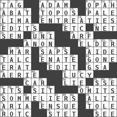 ACROSS 1. Label 4. First man 8. Brightly colored fish 12. Blind as ____ 14. Traditional theme or motif 16. Diluted with white 17. Pale green bean 18. Pleas 20. Prepares for publication 22. And so on (abbr.) 23. Fish or hair follower 24. Elected rep. 25. University (slang) 28. Sandy's bark 30. At once, immediately (arch.) 31. A person who is older than you are 35. Third mo. 37. Plant excrements 40. Helper 41. Baby powder 42. Maternal 44. Went 45. Part of Q.E.F. 46. Prepare for publication 47. Girls' org. (abbr.) 48. Nest on high 50. "I Love _" 52. 4-wheeled motor vehicle 54. Untruth 55. Compass dir. 58. It is 61. Be seated 63. Leaves out 65. Wine waiters 70. Set down 71. Operatic vocal solo 72. Take place subsequently 73. Lacquered or enameled metalware 74. College mil. group 75. Proofreading order 76. Observe DOWN 1. Lies 2. Remain 3. Homeless child 4. Had dinner 5. Spanish title 6. Fitting 7. Greater amount 8. Elect 9. Ache 10. Toward shelter 11. Command 13. Make lace 15. Stalk of a moss capsule 19. Measure of real estate 21. Player for Phoenix 26. Sense of smell 27. Empty; void 29. Tasteless 30. Northern region 32. "Vaya con ____" 33. Pulitzer Prize-winning author Ferber 34. Portuguese money of account (variant) 35. Female horse 36. Having or resembling wings 38. Writing tablet 39. Free from disturbance or agitation 41. Beverage made from leaves 43. Needle holder 49. Comfort 51. Corporate head (abbr.) 53. Cause heat under the collar 55. Grain storage towers 56. Vertical member of a panel or frame 57. First name in cosmetics 58. Austrian river, tributary to the Danube 59. "Corrida" creature 60. Stricken, poetically 62. Canisters 64. Floor protector 66. Big _ 67. Eastern Standard Time (abbr.) 68. Regret 69. Put into a specified state