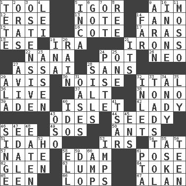 ACROSS 1. Utensil 5. Composer Stravinsky 9. Direct toward a target or goal 12. Celtic language 13. Brief written record 14. Papal veil 15. Jacques of French films 16. ____ d'Azur (French Riviera) 17. Ancient river in northeast Turkey 18. Compass dir. 19. Retirement account (abbr.) 21. Removes the wrinkles 22. Grandmother 24. Plant holder 26. Modern: prefix 27. Slender Brazilian palm 28. Without 29. Advice 30. Annoying sound 32. Slanted text style (abbr.) 36. Not recorded 37. Keyboard modifier key 38. Words to Nanette 39. An important port of Yemen 40. Small island 42. Kenny Rogers chart-topper in '80 43. Lyric poems 44. Shabby and untidy 46. Perceive with the eye 49. Distress signal 50. Pismires 51. Potato state 53. Big collection agency 54. Make lace 57. Nathan's nickname 58. Dutch treat 61. Airs 62. Small, secluded valley 63. Mass 64. Casino tip 65. Car or cant ending 66. Chops off 67. Actor Alda or Thicke DOWN 1. Wig 2. Mouths or openings 3. Clearly or manifestly demonstrative 4. Flowery wreath 5. South American Indian 6. Thick or sticky substance 7. Baseball player Mel 8. To separate or throw off 9. Composer Copland 10. Silly 11. With motion or animation 14. At a great distance 19. _ tizzy (2 wds.) 20. Water falling in drops from the sky 21. ___ a Wonderful Life 23. NE Netherlands city 24. Thick mixture 25. Single 27. Enthusiastic 28. Beverly of Met fame 29. Insect wing 31. Fertile tracts in a desert 32. An arm off of a larger body of water 33. Inedible or poisonous agaric 34. "60 Minutes" Commentator Rooney 35. Myrna of the movies 40. Wedding promise 41. Russian ruler of old 43. Bear (Spanish) 45. Followers of ems 46. Scorch 47. Peak District village in England 48. Consumed 52. Layer 53. Naughty children 55. "____ silly question..." 56. Adolescent 58. Pipe bend 59. Superhero pair 60. Electrical Unit 61. Parent Teacher Assoc.