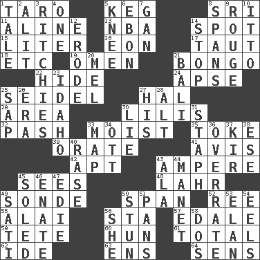 ACROSS 1. Edible starchy tuberous root 5. Barrel 8. _ Lanka 11. Place in a line 13. Basketball assoc. 14. Specific locale 15. 61 cubic inches 16. A really long time 17. Tense 18. And so on (abbr.) 19. Sign of things to come 21. Beat drum 22. Flintstone garb 24. Domed church section 25. Beer mug 27. Actor Linden 29. Length times width 30. Ms. Damita and namesakes 32. Romantic infatuation 33. Damp 35. Casino tip 39. Declaim 41. Opinion 42. Fitting 43. Electrical Unit 45. Perceives with the eye 48. Cowardly lion portrayer 49. Something which is sent 50. Connect, as a bridge 52. To riddle 55. Mountain range southwest of Kyrgyzstan 56. R.R. building 57. Peak District village in England 59. Wig 60. Attila the _ 61. "_____ Recall" 62. Binary compound 63. Followers of ems 64. Elected reps. DOWN 1. Lie 2. Set down 3. Actors Guy, Robert Welles, and Clint 4. Single 5. Leg joint 6. Inky black, to poets 7. Separate the seeds from cotton 8. Connects, as a bridge 9. Makeup applied to the cheeks 10. "Tell ____ the Marines!" 12. Eat (away) 14. Cease 20. Cartoonist voice _ Blanc 21. Indonesian resort city 23. Potato state 25. Plant excrement 26. Epoch 27. Part of HMS, perhaps 28. The first octave above the treble staff 30. Whopper 31. Staphylococcus 33. Atlas unit 34. Baseball player Mel 36. Make much ado about nothing 37. Apertif with cassis 38. Compass dir. 40. To erase 43. Insect wing 44. French painter Edouard 45. Having a sole or soles 46. Related on the mother's side 47. Singer Brickell 49. Suttee (variant) 50. Surprise greatly 51. Zero-star reviews 53. Enthusiasm 54. Snakelike fish 56. A female animal or person 58. Two (Sp.)