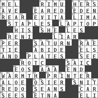 ACROSS 1. Cartoonist voice _ Blanc 4. Tall New Zealand timber tree 8. Possessive pronoun 12. "___ Maria" 13. Having ears or earlike features 14. Locale of original sin 15. Tail end 17. Webber/Rice musical 18. Pale green bean 19. Paper fasteners 21. Portable computer 23. Part of HMS, perhaps 24. A female animal or person 26. French article 27. Painter Guido (1575-1642) 28. One who doesn't tell the truth 30. For each 31. Titan orbits this 34. Actress Charlotte 37. Neckwear 38. Tolerate 39. Raised railways 40. Plus 41. Food holders 42. Observe 43. College mil. group 44. Ketch in the Levant 46. Greek goddess of the dawn 47. Auto club (abbr.) 50. Conclusion 51. Heat 54. Hard copy producer 57. Medicinal plant 58. Flexible twig of a willow tree 60. In a ____ (agitated or irritated) 62. Do over again 63. Seines 64. 4-wheeled motor vehicle 65. Perceives with the eye 66. Inactive volcano in Sicily 67. Biblical high priest DOWN 1. Make imperfect 2. Nights before holidays 3. Resembling or made to resemble leather 4. All-night dance parties 5. From or relating to Ireland 6. Was introduced to 7. Allodial 8. Aide 9. Proofreads 10. San ____ (Riviera town) 11. Fastener 13. Snakelike fish 16. Water falling in drops from the sky 20. Air pressure measure (abbr.) 22. Actor Alda or Thicke 25. Dodge 27. It's straight from the horse's mouth 29. Angers 30. Parent Teacher Association (abbr.) 31. Table seasoning 32. Phillipine bananalike plant 33. Teat (slang) 34. Home 35. Actor Baldwin 36. Compass dir. 41. Mail 43. Lover boys 44. Elected rep. 45. Pismires 46. Wear away 48. Bee-related 49. Sports stadium 51. Armed conflicts 52. Toward shelter 53. Stockings 55. Big collection agency 56. Monetary unit of Yemen 59. Arrange properly for use 61. Three (prefix)
