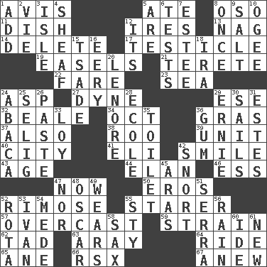ACROSS 1. Opinion 5. Had dinner 8. Bear (Spanish) 11. Food container 12. Angers 13. Tired old horse 14. Keyboard key 17. One of the two male reproductive glands 19. Artist's stands 21. Cigar-shaped 22. Conductor's collection 23. Ocean 24. Cleo's killer 27. Unit of force 29. Compass dir. 32. Memphis, Tenn. Street 34. Sep. follower 36. Pate de foie ____ 37. In addition 38. Friend of Pooh 39. A single undivided whole 40. Municipality 41. Biblical high priest 42. Grin 43. Mature 44. Liveliness 46. Curvy letter 47. At this time 50. Greek god of love 52. Full of chinks, cracks, or crevices 55. A viewer who gazes fixedly 57. Cloudy 59. Put through a sieve 62. Small boy 63. Like ___ of sunshine 64. Travel on an animal 65. One (Scot) 66. Acura sports coupe 67. Afresh DOWN 1. Increase 2. Compete 3. Capri or Wright 4. Archer's quiver 5. "We ___ not amused" (Victoria) 6. Trials 7. First name in cosmetics 8. Single time 9. Table seasoning 10. Double curve, resembling the letter S 12. It is 15. Sadhe (variant) 16. Suggestive of the supernatural 18. Retirement account (abbr.) 20. Poe poem 24. Phillipine bananalike plant 25. Former Milwaukee Brewers owner Bud 26. Thick mixture 28. Learning spot: Fr. 29. Bert's buddy 30. Travel by water 31. _____ Park, CO 33. Myrna of the movies 35. Bathroom 36. Chewing product 42. Derisive sound 45. Caspian sea tributary 47. And not 48. Motion picture award 49. Erodes 51. Father Junipero _ 52. Round or rotation of duties 53. "Terrible" tsar 54. Ancient Persian 55. Filthy place 56. Precipitation 58. Saxophone 60. Binary compound 61. ___ Haven, CT