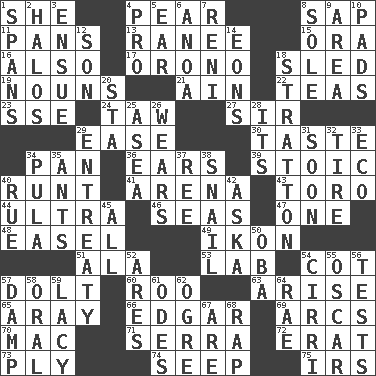 ACROSS 1. A female animal or person 4. Lightbulb-shaped fruit 8. Plant excrement 11. Baking dishes 13. Indian princess (variant) 15. Mouth or opening 16. In addition 17. U. of Maine site 18. Downhill vehicle 19. Parts of speech 21. The 18th letter of the Arabic alphabet 22. Beverages made from leaves 23. Compass dir. 24. The 23rd letter of the Hebrew alphabet 27. Title for a knight 29. Relaxation 30. Clothes sense 34. Baking dish 36. Hearing organs 39. Unemotional 40. The smallest animal of a litter 41. Sports stadium 43. "Corrida" creature 44. Extremist 46. Oceans 47. Single 48. Artist's stand 49. Picture 51. In the manner of 53. Experiment locale 54. Small bed 57. Dunce 60. Friend of Pooh 63. Originate 65. Like ___ of sunshine 66. _ Allan Poe 69. Curves 70. Apple computer (short form) 71. Spanish missionary in California 72. Part of Q.E.F. 73. Apply oneself diligently 74. Ooze 75. Big collection agency DOWN 1. Connects, as a bridge 2. Auras 3. Follow as a consequence or result 4. Adept person 5. Ewer handle 6. Small Philippine buffalo 7. Painter Guido (1575-1642) 8. Not divided or shared with others 9. Length times width 10. Groovy apts. 12. Manchild 14. Immeasurably long periods of time 18. Ski resort town in Vermont 20. R.R. building 25. At sea 26. Puts on (as clothing) 28. ___ a Wonderful Life 29. Plea 31. Within a short period 32. Hoop that covers a wheel 33. Environmental prefix 34. Monetary unit of Botswana 35. Pismires 37. To sift 38. Slow-paced one 40. Sorrow 42. "____ silly question..." 45. Everything 50. Chief or king in Benin or Nigeria 52. Ancient Greek god of war 54. High-altitude cloud 55. Motion picture award 56. Trials 57. Moist 58. Taken by mouth 59. Made of lace 61. Lyric poems 62. Legendary monster 64. Actress Charlotte 67. "We ___ not amused" (Victoria) 68. Strike