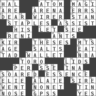 ACROSS 1. Actor Linden 4. Tiny particle 8. Wise men 12. "We ___ not amused" (Victoria) 13. Sports stadium 14. Blunders 15. Letter starter 17. One who wires 18. Comedian Laurel of Laurel & Hardy 19. Paper fasteners 21. Help 23. Part of HMS, perhaps 24. Allow 26. Perceive with the eye 27. Painter Guido (1575-1642) 28. Pismires 30. Apertif with cassis 31. College papers 34. Mountains (abbr.) 37. Mature 38. Table seasonings 39. Ingest 40. Small amount or degree 41. Place for singles 42. Basketball assoc. 43. "Corrida" creature 44. Flaplike coverings 46. For each 47. Compass dir. 50. _ tizzy (2 wds.) 51. Flew 54. Center 57. Writer Wiesel 58. Having winglike extensions 60. The founder of a family 62. Left 63. Music written for nine 64. Shallow baking pan 65. Sense of smell 66. Global Positioning Systems (abbr.) 67. It is so DOWN 1. Possessed 2. Ancient Greek god of war 3. Resembling or made to resemble leather 4. Satellite of Uranus 5. Laconic 6. Single 7. Hindu Mythology: god of death 8. Makes clutter 9. Nick name for Arthur 10. Pate de foie ____ 11. Is not 13. Leather borer 16. Precipitation 20. 23rd letter of the Greek alphabet 22. Fast planes 25. Clothes sense 27. Capital of Latvia 29. Egg locale 30. Krazy ___ of comics 31. Russian ruler of old 32. Saint headwear 33. Pipe bend 34. Ananias' fault 35. Bar bills 36. R.R. building 41. Had on 43. Cylindrical with tapered ends 44. Falsehood 45. Restaurants 46. Aches 48. Seines 49. _____ Park, CO 51. Stitched 52. Butter sub 53. Mild oath, euphamism for damn 55. Arrange properly for use 56. 4th largest of the Great Lakes 59. Trim (branches) 61. Followers of ems