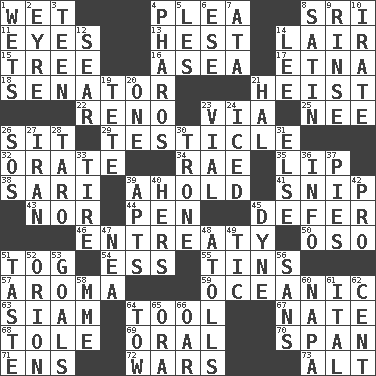 ACROSS 1. Dripping 4. Entreaty 8. _ Lanka 11. Sight organs 13. Behest 14. Den 15. Woody plant 16. At sea 17. Inactive volcano in Sicily 18. Legislator 21. Robbery 22. Former U.S. Attorney General Janet 23. By way of 25. Born 26. Be seated 29. One of the two male reproductive glands 32. Declaim 34. Actress Charlotte 35. Mouth edge 38. Indian skirt 39. Hold, grip (Informal) 41. Clip 43. Not either 44. Writing instrument 45. Postpone 46. Plea 50. Bear (Spanish) 51. Coat; cloak 54. Double-curved letter 55. Metal containers 57. Scent 59. Pertaining to the sea 63. Thailand, formerly 64. Instrument 67. Nathan's nickname 68. Lacquered or enameled metalware 69. Taken by mouth 70. Connect, as a bridge 71. Followers of ems 72. Armed conflicts 73. The first octave above the treble staff DOWN 1. Moistens 2. Jane of fiction 3. Adolescent 4. N Egypt peninsula 5. French article 6. Compass dir. 7. _ moment's notice (2 wds.) 8. Smooth fabric 9. Remove soap 10. Feeling or showing extreme anger 12. Shrivel 14. Area sheltered from the wind 19. Wig 20. Single 21. Actor Linden 23. Small bottle 24. On the rocks 26. Distress signal 27. SW Asia republic 28. Edible starchy tuberous root 30. Marketplace scale 31. Otherwise 33. Become fatigued 36. A message received and understood 37. Sliced desserts 39. Tenement units (abbr.) 40. Possessive pronoun 42. Adept person 45. Centimeter-gram-second unit of force 47. Teachers' org. 48. Ringlike coral islands and reefs 49. Nervous spasm 51. Clothes sense 52. Constellation of myth 53. Scores awarded for successful feats 56. Without 58. Madame (abbr.) 60. California wine valley 61. Slanted text style (abbr.) 62. Penny 64. Pull behind 65. Mouth or opening 66. Rowing implement