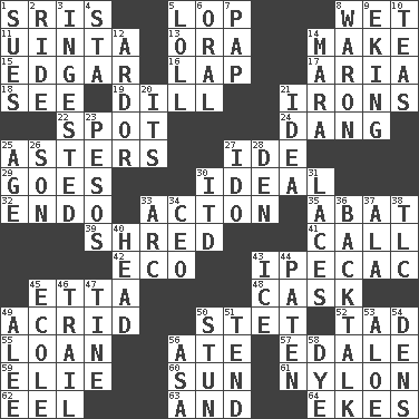 ACROSS 1. Indian titles of respect 5. Chop off 8. Dripping 11. National forest in Provo, Utah 13. Mouth or opening 14. Create 15. _ Allan Poe 16. Pet locale 17. Roberta Peters solo 18. Perceive with the eye 19. Deli pickle 21. Metal shackles 22. Blemish 24. Mild oath, euphamism for damn 25. Michaelmas daisies 27. Binary compound 29. Moves 30. Standard of perfection 32. Inside; within (prefix) 33. 13-14th century defensive garment 35. Blind as ____ 39. Tear up 41. Give a ring to 42. Environmental prefix 43. Medicinal drug used to evoke vomiting 45. Singer James 48. Keg 49. Bitter 50. Proofreading order 52. Small amount or degree 55. Grant temporary use of 56. Had dinner 57. Peak District village in England 59. Writer Wiesel 60. Player for Phoenix 61. High-strength synthetic material 62. Snakelike fish 63. Added to 64. Supplements with great effort DOWN 1. Takes to court 2. Travel on or in a vehicle 3. Eaten 4. R.R. building 5. Hang loosely or laxly 6. Of the mouth 7. Infant food 8. Make _____ (do battle with) 9. Supplementing with great effort 10. Beverages made from leaves 12. Zeal 14. Hindu Mythology: god of death 20. It is 21. The content of cognition 23. Mexican monetary units 25. Ripen 26. Male child 27. Wedding promise 28. Lair 30. It would 31. Shoestrings 33. Curve 34. Corporate head (abbr.) 36. Sass 37. In the manner of 38. Affectionate concern, for short 40. Froth on beer 43. Frozen water 44. Eucharist need 45. Learning spot: Fr. 46. Drop behind 47. Prong on a fork 49. Toward shelter 50. Surprise greatly 51. Watch over 53. Medicinal plant 54. Lairs 56. White ___ sheet 58. Color