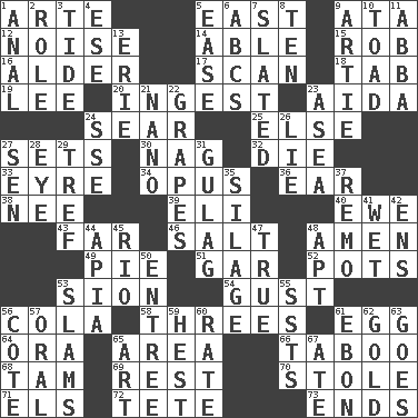 ACROSS 1. Johnson of "Laugh-In" 5. Compass direction 9. _ moment's notice (2 wds.) 12. Annoying sound 14. Competent 15. Director Reiner 16. Tree or shrub in the Birch family 17. Glance over 18. Bar bill 19. Area sheltered from the wind 20. Eat 23. Opera by Verdi 24. Dry up 25. Otherwise 27. Arranges properly for use 30. Tired old horse 32. Pass on 33. Jane of fiction 34. Musical composition 36. Hearing organ 38. Born 39. Biblical high priest 40. She-sheep 43. Distant 46. Table seasoning 48. So be it 49. Sliced dessert 51. Slender fish 52. Plant holders 53. The Jewish people; Israel 54. Abrupt rush of wind 56. Root beer relative 58. Trios 61. Oval reproductive body of a fowl 64. Mouth or opening 65. Type of rug 66. Off limits 68. Scottish cap 69. Respite 70. Took without asking 71. Raised railways 72. False hair 73. Conclusions DOWN 1. Of or related to the anus 2. Hero or heavy, e.g. 3. Event that recurs at intervals 4. Compass dir. 5. Comfort 6. Lettered men learn these first 7. Scheduled 8. Nine, plus one 9. Nick name for Arthur 10. Frog relative 11. Swedish rock group 13. 4th largest of the Great Lakes 21. Billionth: prefix 22. Raisin fruits 23. Toward the sea 24. Compass dir. 26. Untruth 27. Elected rep. 28. Sight organ 29. Unclean, religiously 31. Russian prison camp 35. Fodder prepared in a silo 37. San ____ (Riviera town) 41. Soggy 42. Followers of ems 44. Capital of Western Samoa 45. _ de Janeiro 47. Loyal 48. Fitting 50. Main course 53. Criticizes harshly 55. Fast planes 56. ____ d'Azur (French Riviera) 57. Of the mouth 59. Command 60. Assign a rank or rating to 61. Inky black, to poets 62. Gilded 63. Moves 65. Tate display 67. Had dinner