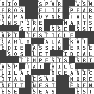 ACROSS 1. River (Sp.) 4. Practice fight 8. Compass dir. 11. Greek god of love 13. Writer Wiesel 14. Lightbulb-shaped fruit 15. California wine valley 16. Centimeter-gram-second unit of force 17. Story 18. Heighten or intensify 21. Shops 22. Play the lead 23. Compass dir. 25. Fast jet (abbr.) 26. Fitting 29. One of the two male reproductive glands 32. Monte _, Las Vegas Hotel/Casino 34. Chicken ___ king 35. Krazy ___ of comics 38. Singer Brickell 39. NE Netherlands city 41. Celtic language 43. Mayday 44. Allow 45. Standard of perfection 46. Storms 50. _ Lanka 51. Cleo's killer 54. Make lace 55. Land elevation 57. Pale purple color 59. Pertaining to the sea 63. Slanted text style (abbr.) 64. He sold his birthright 67. Greater amount 68. Remaining after all deductions 69. A home for chicks 70. Paradise 71. Compass dir. 72. Oceans 73. Eastern Standard Time (abbr.) DOWN 1. Painter Guido (1575-1642) 2. SW Asia republic 3. I made a mistake 4. Spring feasts 5. Travel a route regularly 6. The 18th letter of the Arabic alphabet 7. Portuguese money of account (variant) 8. Erodes 9. Table seasonings 10. Take or capture by force 12. Plant excrements 14. Parent Teacher Association (abbr.) 19. "Tell ____ the Marines!" 20. Actress Charlotte 21. Cartoonist voice _ Blanc 23. Filth; sediment 24. Skim 26. Adept person 27. Writing tablets 28. Musical group of three 30. Clothes sense 31. Made supply last 33. For fear that 36. Ancient Greek god of war 37. Russian ruler of old 39. _ mater 40. Back-to-school mo. 42. Connecticut Ivy Leaguer 45. Capri or Wright 47. And so on (abbr.) 48. Yells 49. Nervous spasm 51. Place in a line 52. Locates 53. Food holder 56. Unable to walk 58. The first octave above the treble staff 60. Connecting point 61. Angers 62. Penny 64. Followers of ems 65. Observe 66. White ___ sheet