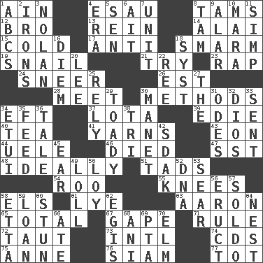 ACROSS 1. The 18th letter of the Arabic alphabet 4. Son of Isaac 8. Scottish caps 12. Sis' sibling 13. It's straight from the horse's mouth 14. Mountain range southwest of Kyrgyzstan 15. Lacking warmth 17. Opposed to 18. Excessive but superficial compliments 19. Slow-paced one 21. Attempt to accomplish something 23. Reproach for some lapse or misdeed 24. Contemptuous expression 26. Eastern Standard Time (abbr.) 28. Confront 30. Modes 34. Newt 37. Globular water bottle used in Asia 39. Singer Brickell 40. Afternoon social gathering 41. Entertaining tales 43. Period of immesurable duration 44. Ubangi River tributary 46. Passed on 47. Fast jet (abbr.) 48. Under perfect conditions 51. Small boys 54. Friend of Pooh 55. Leg joints 58. Raised railways 61. Sodium hydroxide 63. Composer Copland 65. "_____ Recall" 67. Open wide 71. Governing power 72. Pulled tight 73. International (abbr.) 74. Music discs 75. Queen of England 1702-14 76. Thailand, formerly 77. Small child DOWN 1. Lettered men learn these first 2. Removes the wrinkles 3. Pitcher Ryan 4. Period 5. Elected rep. 6. Small island 7. A single undivided whole 8. Scottish cap 9. Having or resembling wings 10. Hindu Mythology: god of death 11. Simple or foolish person 16. South Vietnam president (1954) 18. System (abbr.) 20. Area sheltered from the wind 22. To riddle 25. Have confidence or faith in 27. Definite Article 29. Sycophant 30. French painter Edouard 31. Lyric poems 32. "Vaya con ____" 33. Posted 34. Needle case 35. Nourish 36. Falsehood 38. Three (prefix) 42. Neighbor of Neb. 45. Hearing organ 49. Hang loosely or laxly 50. Myrna of the movies 52. Heredity factor (abbr.) 53. Singe 56. Spew [out] 57. Twentieth part of a lira 58. Singer James 59. Grant temporary use of 60. Make senseless or dizzy 62. The front part of a cuirass 64. Egg locale 66. Had dinner 68. Cuckoo 69. Parent Teacher Assoc. 70. Shade tree