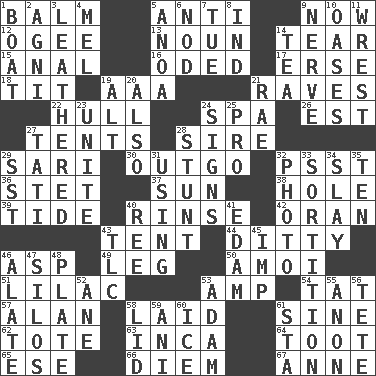 ACROSS 1. Lip ointment 5. Opposed to 9. Immediately 12. Double curve, resembling the letter S 13. Part of speech 14. Pull apart 15. Of or related to the anus 16. Wrote a lyric poem 17. Celtic language 18. Teat (slang) 19. Auto club (abbr.) 21. All-night dance parties 22. Frame or body of a ship 24. Health resort 26. Eastern Standard Time (abbr.) 27. Portable shelters 28. Father 29. Indian skirt 30. Outlay 32. Inconspicuous attention getter 36. Proofreading order 37. Player for Phoenix 38. Opening into or through something 39. Periodic rise and fall of the sea level 40. Remove soap 42. Northwest Algerian city 43. Portable shelter 44. Short, simple song 46. Viper 49. Part of a journey 50. Mine, in Marseilles 51. Pale purple color 53. Electrical Unit 54. Make lace 57. ____ Jay Lerner 58. Put down 61. Trig term 62. Haul 63. South American Indian 64. A blast of a horn 65. Compass dir. 66. South Vietnam president (1954) 67. Singer Murray DOWN 1. Water vessel 2. Hindu god of fire 3. Resembling or made to resemble leather 4. Cartoonist voice _ Blanc 5. Small Philippine buffalo 6. Dreamland 7. Third day of the wk. 8. Indiana (abbr.) 9. Effrontery 10. Fertile tracts in a desert 11. Take or capture by force 14. Afternoon social gathering 19. The first octave above the treble staff 20. In addition 21. Actress Charlotte 23. Join together 24. Omens 25. Adept person 27. Jacques of French films 28. Check the growth or development of 29. Fast jet (abbr.) 31. Exploiting 32. Picture 33. Casting lots 34. Kill 35. "___ Little Indians" 40. To riddle 41. Dutch treat 43. Affectionate concern, for short 45. Mischievous child 46. Having winglike extensions 47. Grain storage towers 48. Food holder 52. One (Scot) 53. First of billions? 55. At once, immediately (arch.) 56. Wig 58. Flaplike covering 59. Cuckoo 60. Frozen water 61. R.R. building