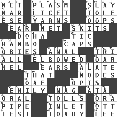 ACROSS 1. Was introduced to 4. Suffix with ecto or cyto 9. Kill 13. Spoil 14. It is permitted: Lat. 15. Lacquered or enameled metalware 16. Compass dir. 17. Entertaining tales 18. I made a mistake 19. Hearing organ 21. Fish or hair follower 22. Burlesque acts 24. Capital of the state of Qatar 26. Nervous spasm 27. Role for Stallone 29. Smile enhancers 30. Off-Broadway awards 31. Of or related to the anus 33. Three (prefix) 36. 100% 37. Shoved, as through a crowd 40. Rowing implement 41. Cartoonist voice _ Blanc 42. Hearing organs 43. Having winglike extensions 45. Not this but _ 47. Methods 48. Clumsy lout 49. Chooses 50. Poet Dickinson 52. Tired old horse 54. "One Day ___ Time" 56. Of the mouth 57. For Whom the Bell _____ 59. Mouth or opening 61. Corncob 62. An arm off of a larger body of water 63. Baseball player Mel 64. Trial 65. Sycophant 66. Area sheltered from the wind DOWN 1. Madame (abbr.) 2. Relaxation 3. Excercise machine 4. Strand of rope, yarn or thread 5. Climbing, woody, usually tropical vines 6. 43,560 square feet 7. Posted 8. Mountains (abbr.) 9. Unemotional ones 10. Plunder 11. High mountains 12. It is so 20. Loose flowing garment 22. Showing deterioration from age 23. Sleep 25. Stockings 27. Wander aimlessly 28. Competent 29. Crow sounds 31. Blind as ____ 32. Or not 33. Inedible or poisonous agaric 34. Assign a rank or rating to 35. Angers 38. Like summer trees 39. Moist 44. Globular water bottle used in Asia 45. Bathroom 46. Actor Linden 49. Stared at amorously 50. One of the Great Lakes 51. Atlas contents 52. Words to Nanette 53. Silent film actress Nazimova 55. Johnson of "Laugh-In" 56. Choose 57. Teat (slang) 58. Filthy place 60. Had dinner