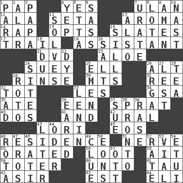 ACROSS 1. Infant food 4. Affirmative reply 7. ____ Bator, Mongolia 11. Insect wing 12. Bristle 13. Odor 14. Strike 15. Elects 16. Chalkboards 17. Lag or linger behind 19. Helper 21. Movie disc 23. _ vera 24. Chop _ 25. Pipe bend 26. The first octave above the treble staff 29. Remove soap 30. Mountains (abbr.) 31. To separate or throw off 32. Small child 33. French article 34. Girls' org. (abbr.) 35. Had dinner 36. Car or cant ending 37. Small fatty European fish 40. Two (Sp.) 41. Also 42. Mountain range 43. Australian parrot (variant) 45. Greek goddess of the dawn 46. Home 51. Boldness 55. Spoke pompously 56. Spoils 58. Small island 59. Carrier 60. To (old English) 61. The 19th letter of the Greek alphabet 62. SW Saudi Arabia district 63. Eastern Standard Time (abbr.) 64. Biblical high priest DOWN 1. Role in a play 2. Having or resembling wings 3. Dad 4. Slangy assent 5. Singer James 6. Backtalk 7. A salt of uric acid 8. Globular water bottle used in Asia 9. So be it 10. Political cartoonist Thomas 12. Finds the solution 13. In addition 16. Beverly of Met fame 18. Goddess of spring and wife of Bragi 20. Table seasonings 22. Color 24. Locates 25. Make improvements or corrections to 26. Therefore, facetiously 27. For fear that 28. Beverage made from leaves 29. Printing process, for short 32. Small boy 33. Soviet premier 1918-24 36. Having ears or earlike features 37. Institute legal proceedings 38. Right away 39. To erase 43. 61 cubic inches 44. Baltic tributary 46. Round or rotation of duties 47. Greek god of love 48. Suttee (variant) 49. A slight indication 50. Immeasurably long periods of time 52. Assign a rank or rating to 53. Small bottle 54. Needle case 57. Baseball player Mel